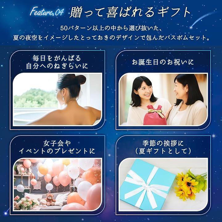 」 50パターン以上の中から選び抜いた、夏の夜空をイメージしたとっておきのデザインでバスボムを包みました。