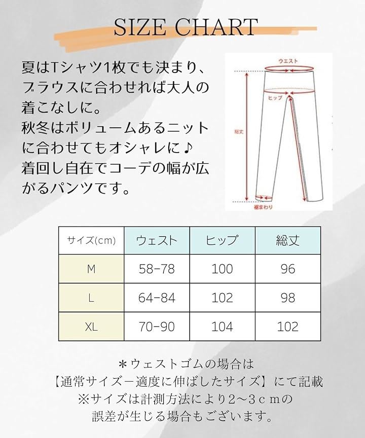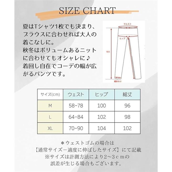 「選べる サイズ カラー 着回し 自由 な レディース パンツ」M L XL の 3サイズ、ブラック ベージュ カーキ ホワイト デニム の 5色展開。
