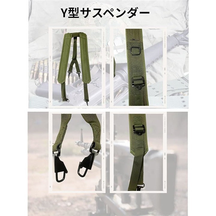 サスペンダーについて「腰装備を快適にサポートするY型サスペンダー構造」本商品は、米軍仕様を踏襲したY字型サスペンダーで、ピストルベルトやタクティカルベルトに対応した設計です。