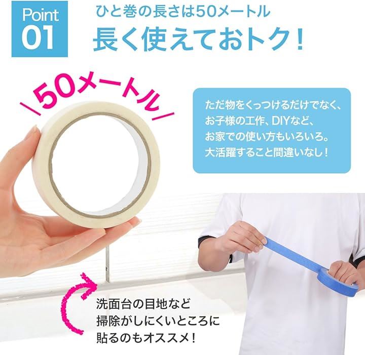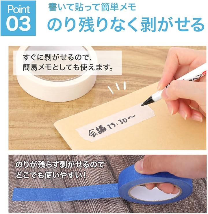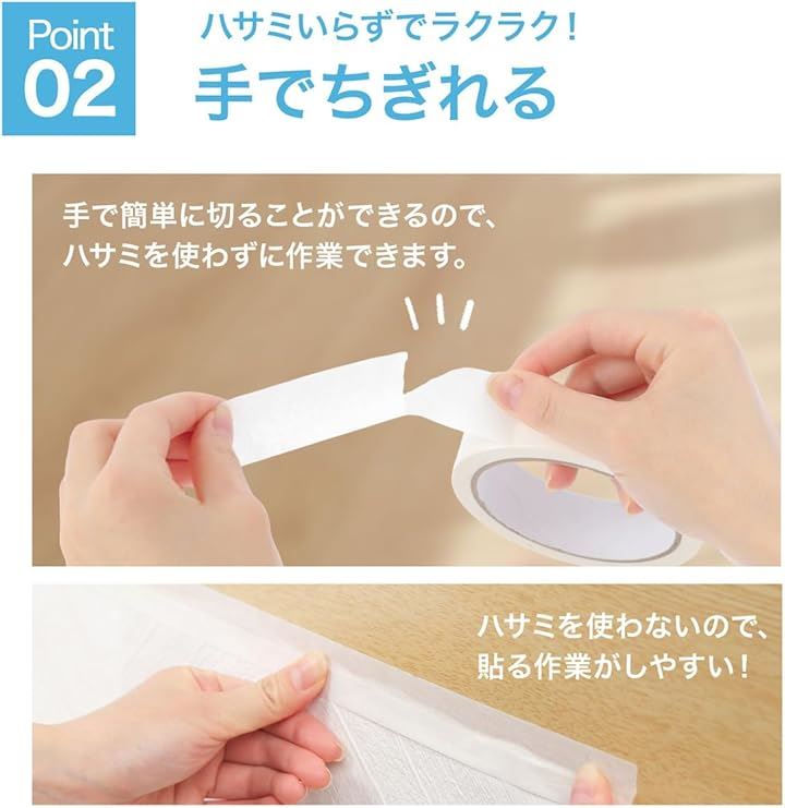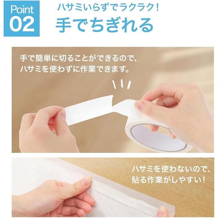 「ハサミなしでサッと使える便利なマスキングテープ。」 「このマスキングテープは手で簡単にちぎることができるので、どんな場面でもすぐに使えます。