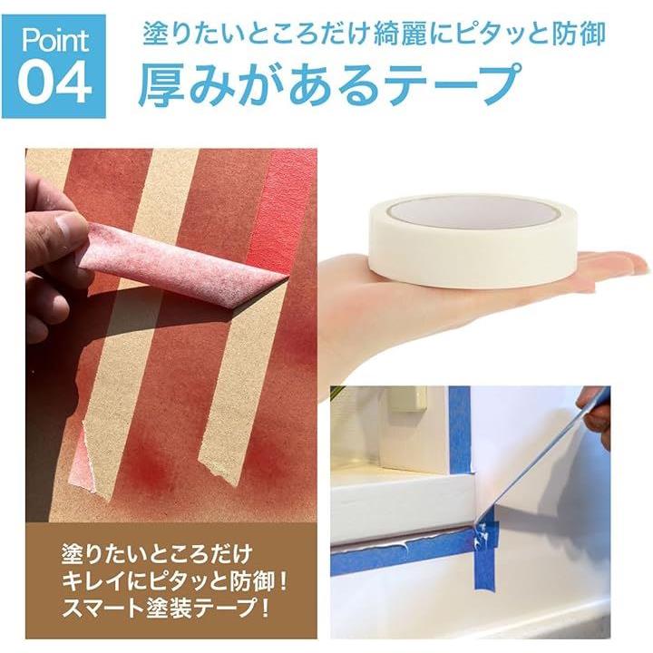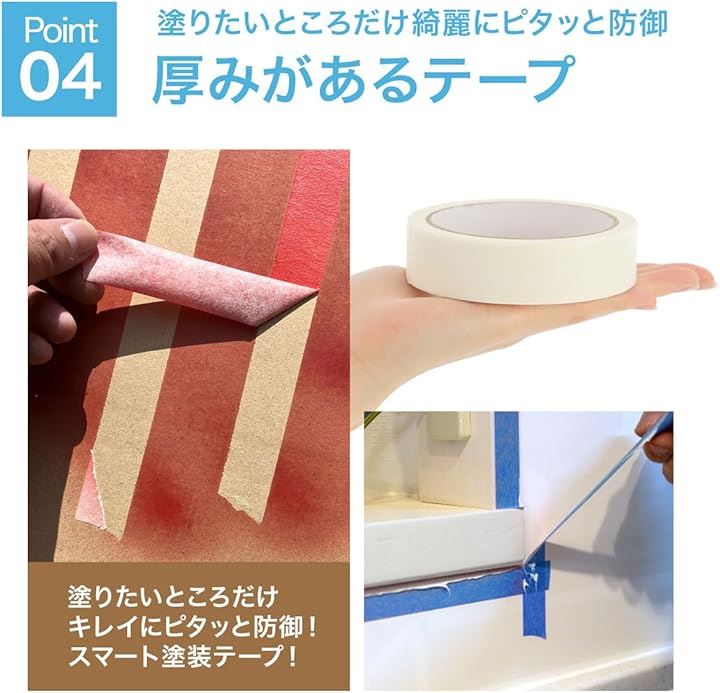 「現場でも安心。たっぷり使えるマスキングテープ」 ・本50mのロングタイプが4本セット。合計200mだから、貼って・はがしてをくり返す現場作業にも十分な量。