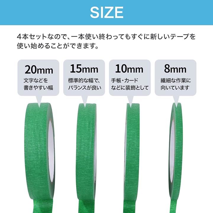 このマスキングテープは、8mm、10mm、15mm、20mmの4種類の太さがあります。