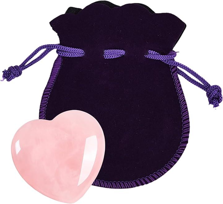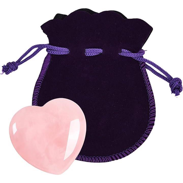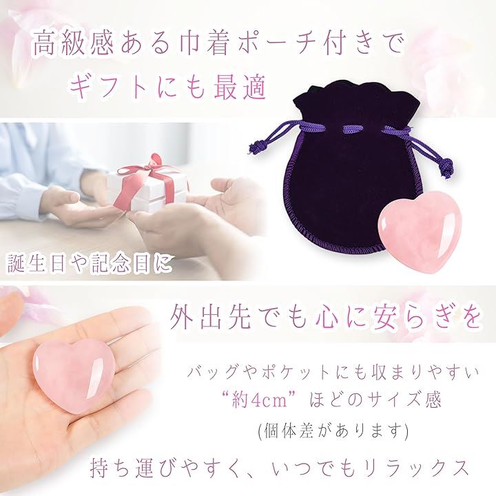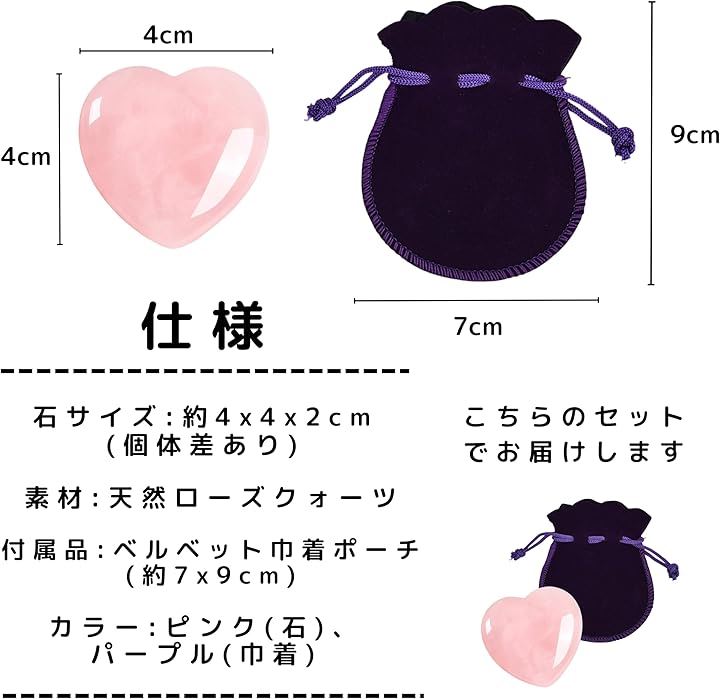 ローズクォーツ 天然石 ハート型 癒しグッズ パワーストーン 水晶 置物 ギフト お守り 紫ベルベット巾着付き