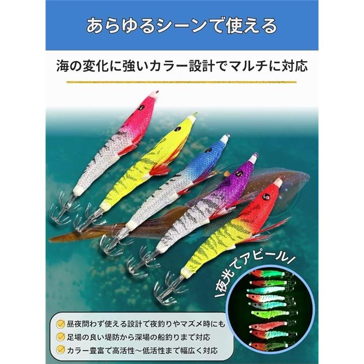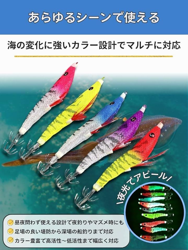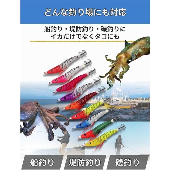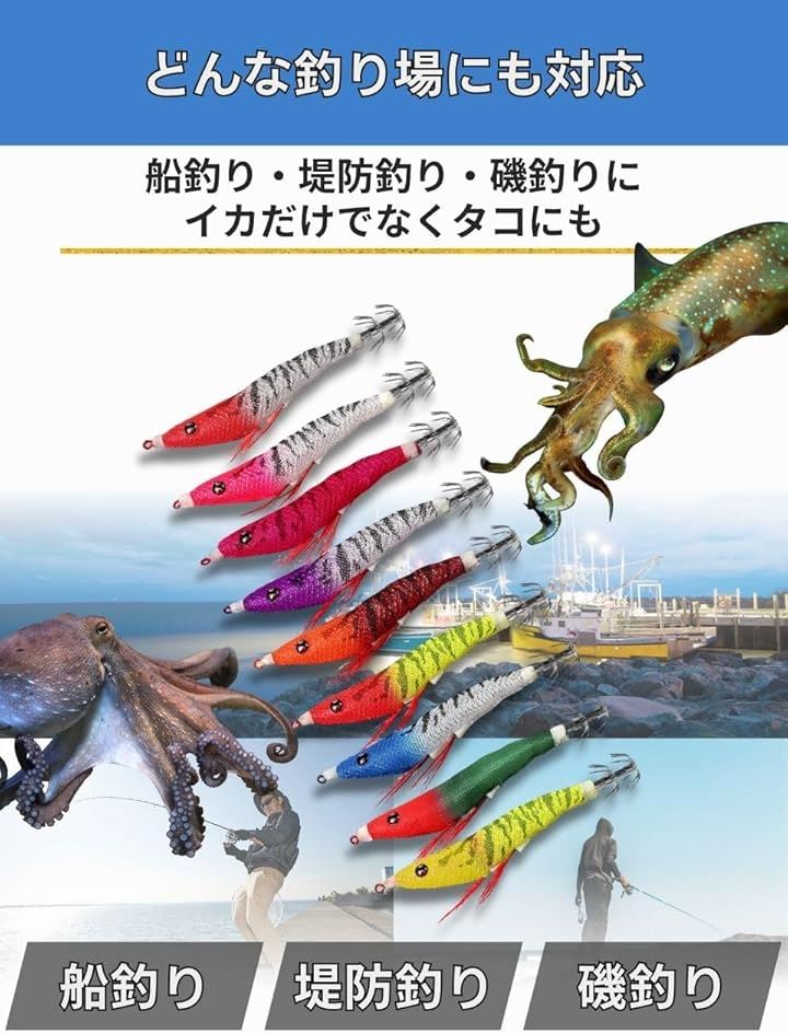 船釣り、波止釣り、磯釣りなど様々な釣り場で活用でき、ケンサキイカ、アオリイカ、ヤリイカ、スルメイカなど多様なターゲットをカバーできます。
