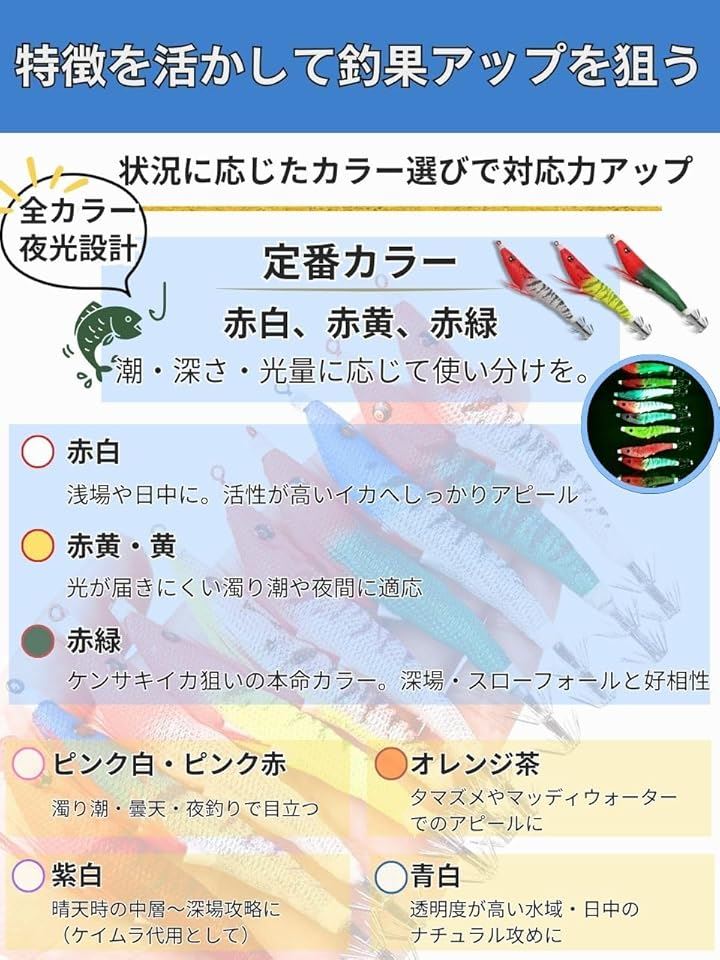 視認性の高いグロー系カラーを活用することで、イカへのアピール力を高めることができます。