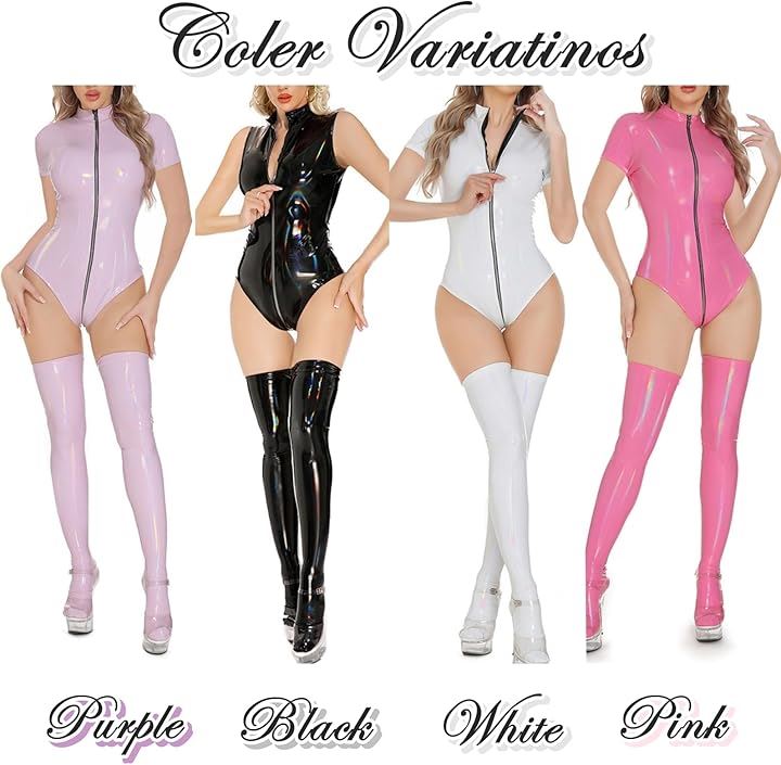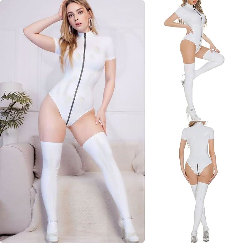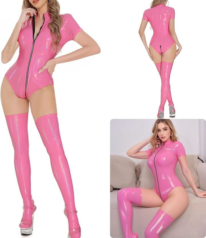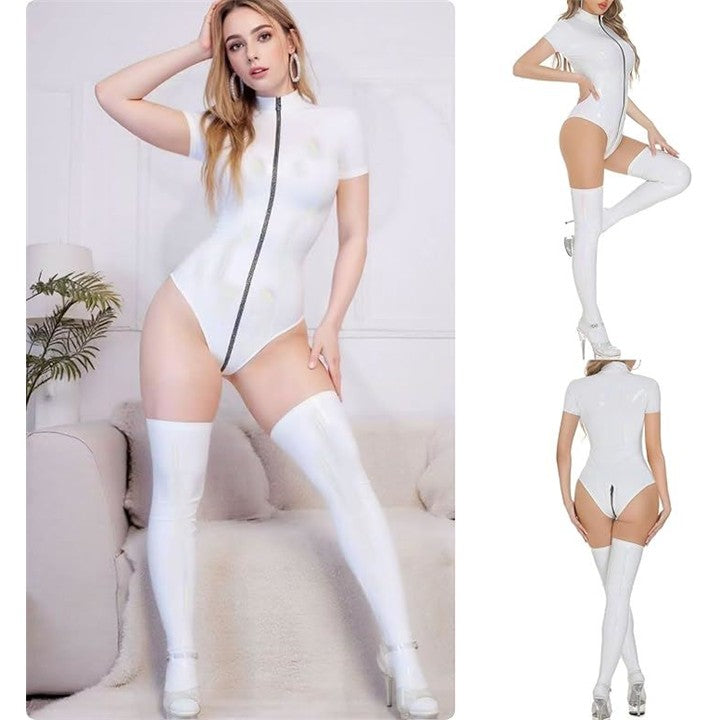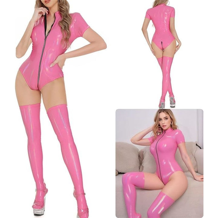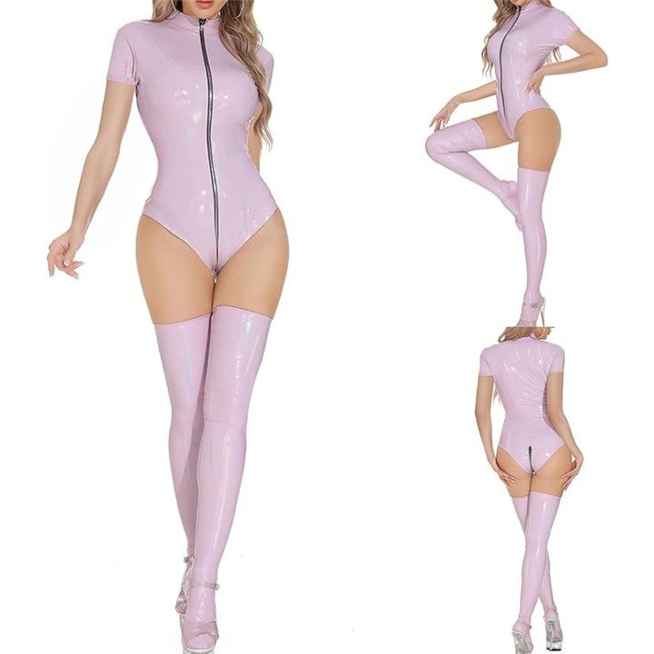 艶やかなエナメル風の光沢が妖艶に輝く、ボディースーツxタイツの魅惑のセットアップ。