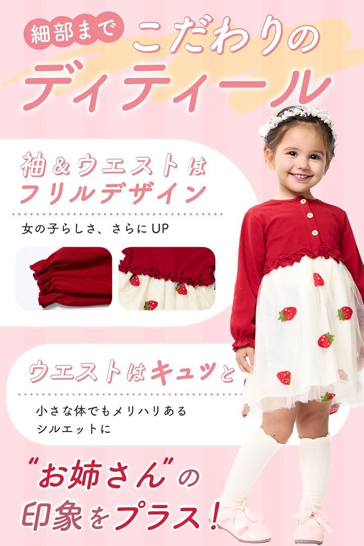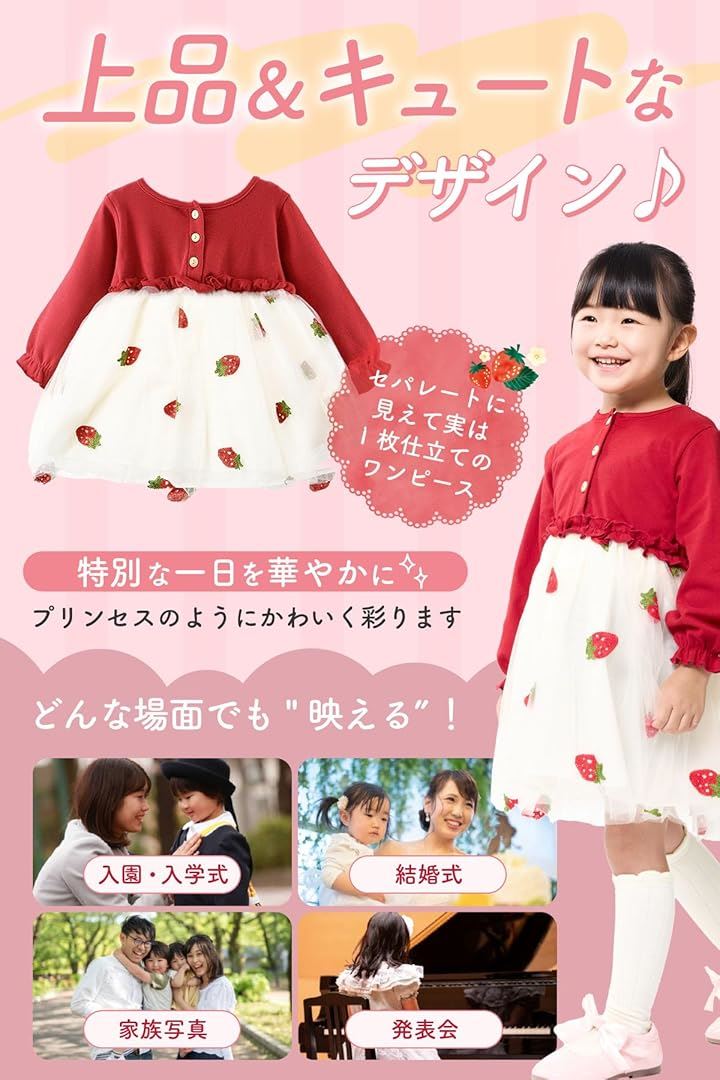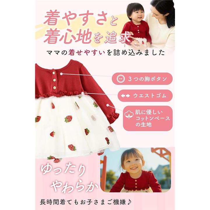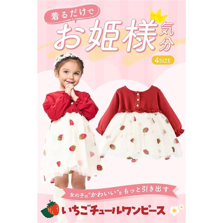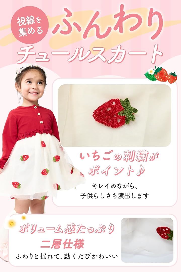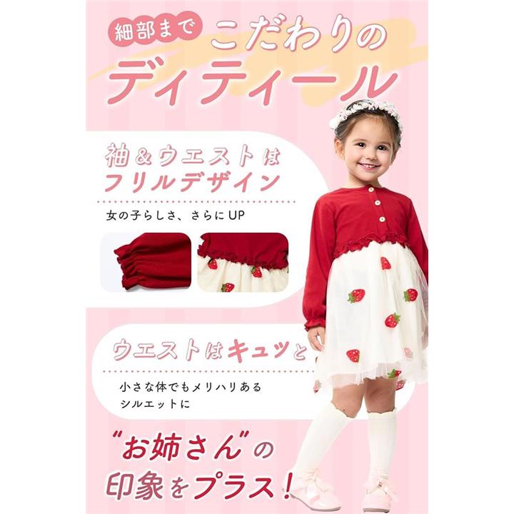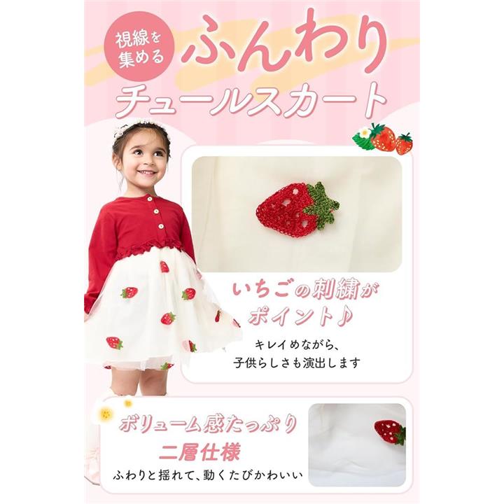 イチゴ刺繍とふんわりチュール ベビー ワンピース チュチュドレス 子供服 女の子 長袖 プリンセス風 赤ちゃん キッズ フォーマル お出かけ 誕生日 入園式 記念撮影 発表会 結婚式