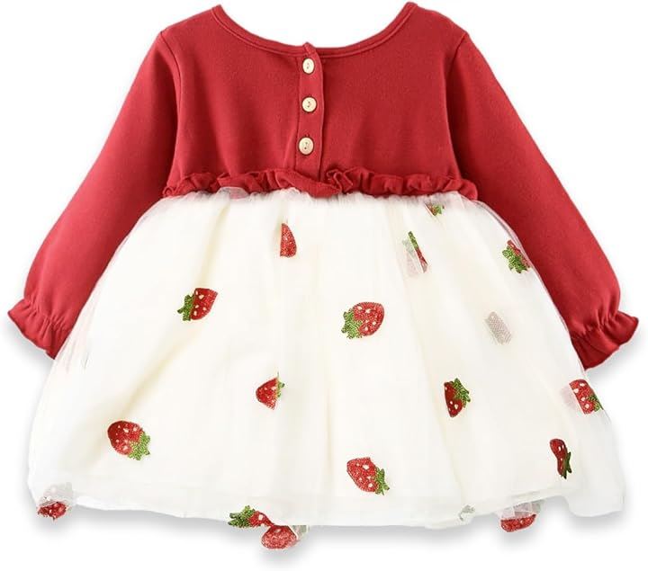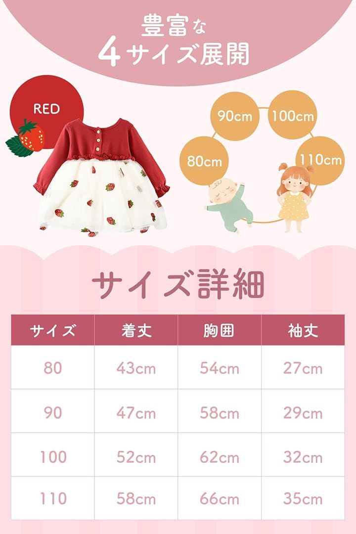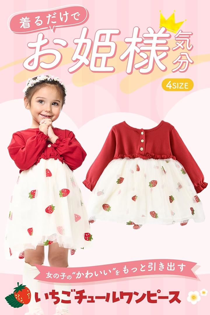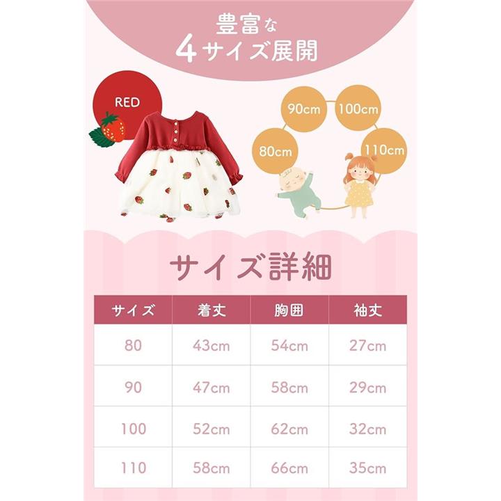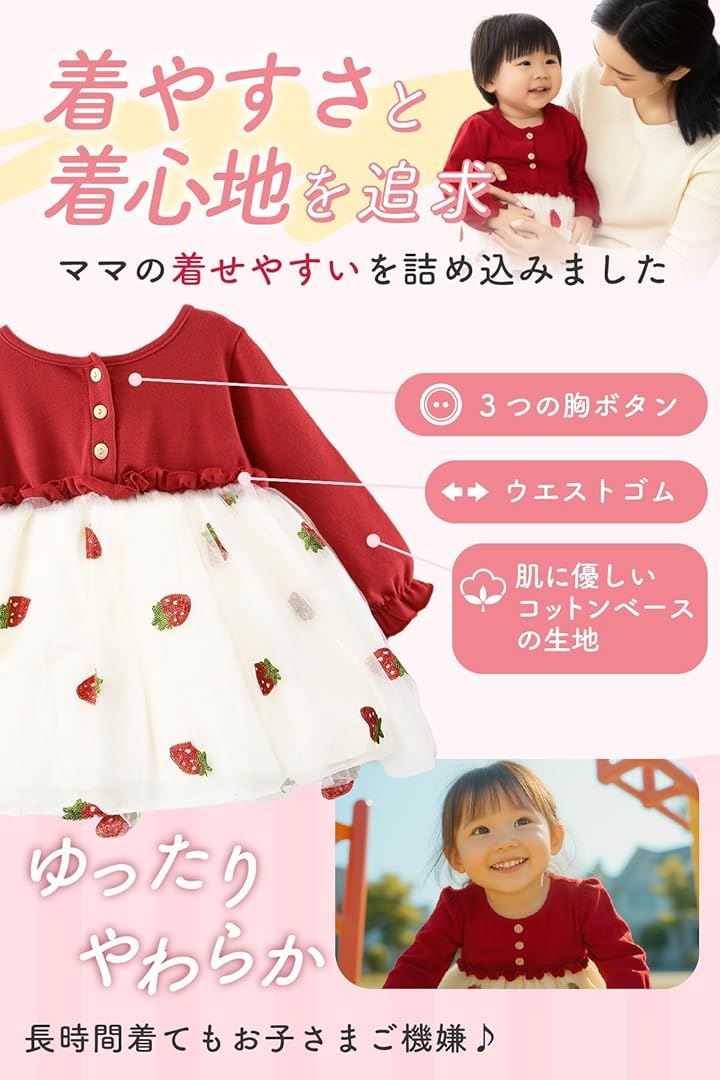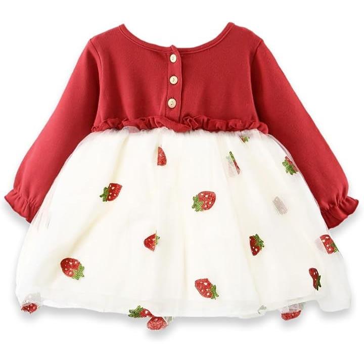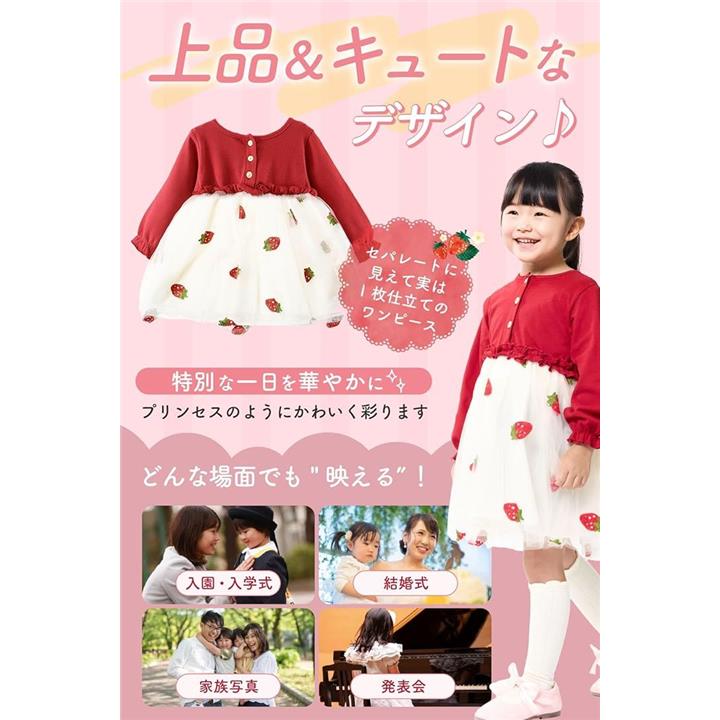 イチゴ刺繍とふんわりチュール ベビー ワンピース チュチュドレス 子供服 女の子 長袖 プリンセス風 赤ちゃん キッズ フォーマル お出かけ 誕生日 入園式 記念撮影 発表会 結婚式