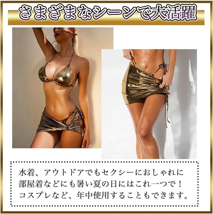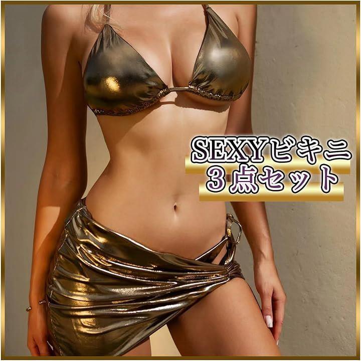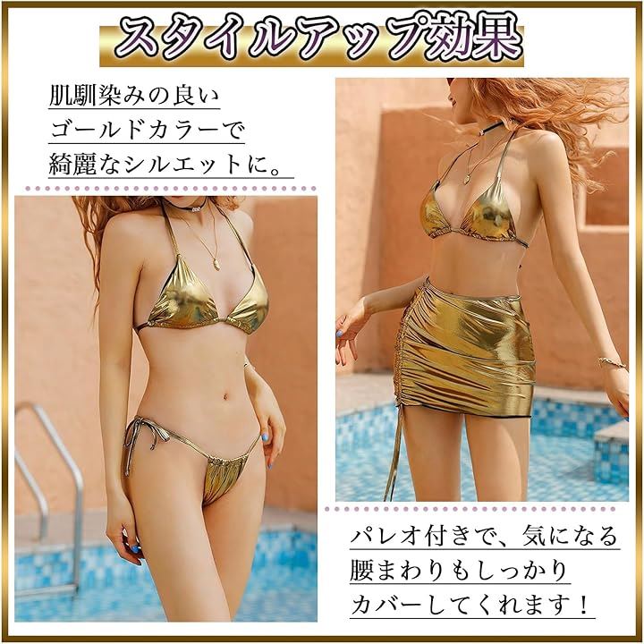 ビキニ メタリック 3点セット 水着 紐三角 光沢 ホルターネック パレオ スイムウェア 海 プール リゾート イベント レディース