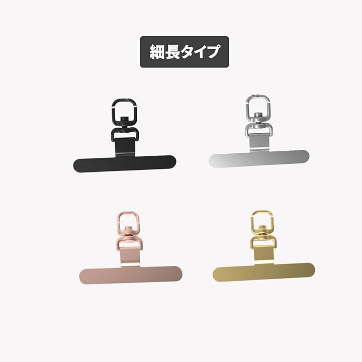 「使い方」 簡単2ステップで装着可能: 1. スマホケースの充電口からホルダーのDカンを出す 2. ケースにスマホを装着するだけ 「商品仕様」 *素材:ステンレス *カラー:ブラック / シルバー / ゴールド / ゴールドピンク *タイプ:細長タイプ ・寸法:横幅 約45mm x 縦幅 約8mm ・厚さ:約0.3mm ・重量:約1.4g 「対応機種」 ・iPhone / Android など各種スマートフォンに対応 ・ストラップホールのないスマホケースにも対応 「セット内容」 ・ストラップホルダー(細長タイプ)
