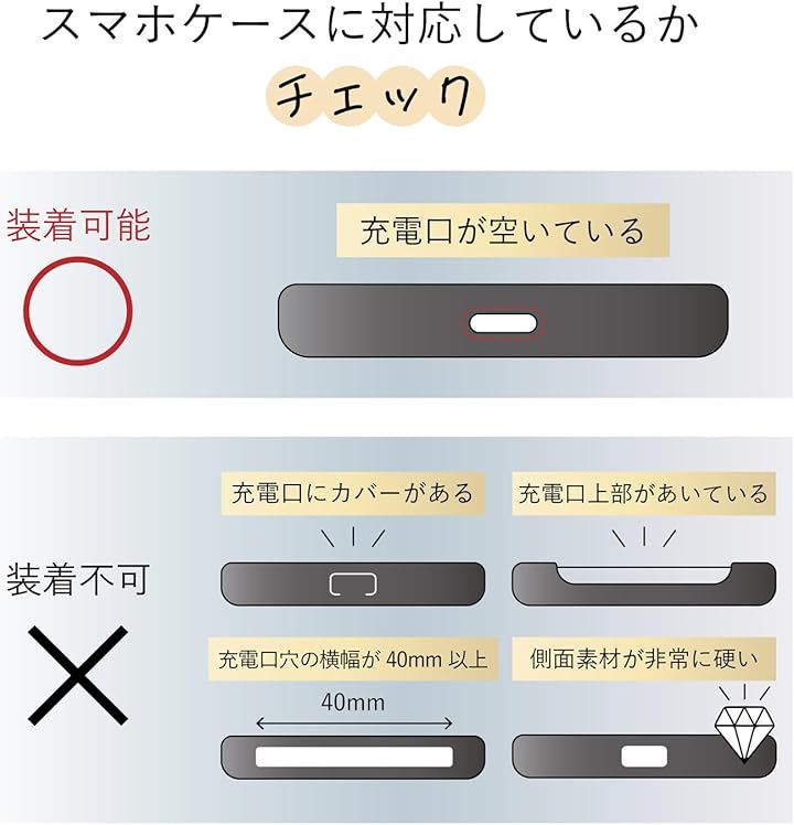 スマホケースにフィットし、充電口を塞がず装着したまま使用できます。