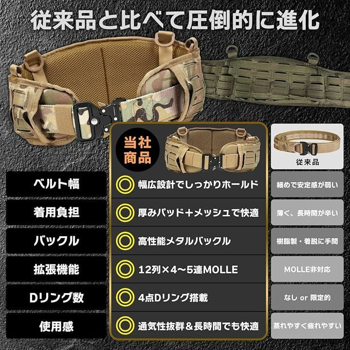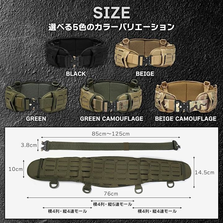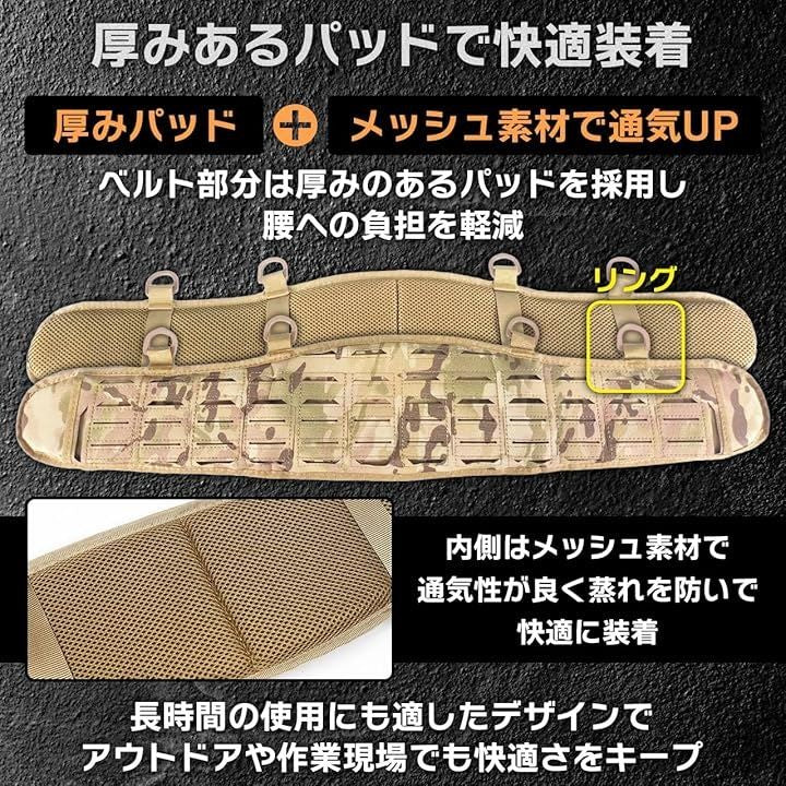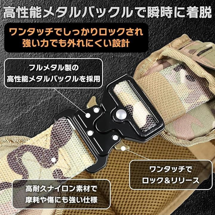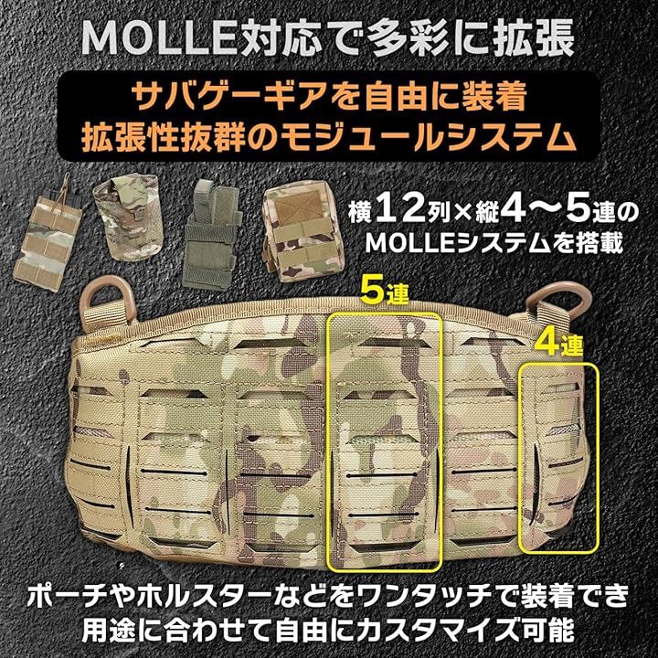 MOLLE対応で多機能ポーチも装着可能、サバゲーやアウトドア、ミリタリー装備として幅広く活用できる、実用性とデザイン性を兼ね備えたタクティカルベルトです。