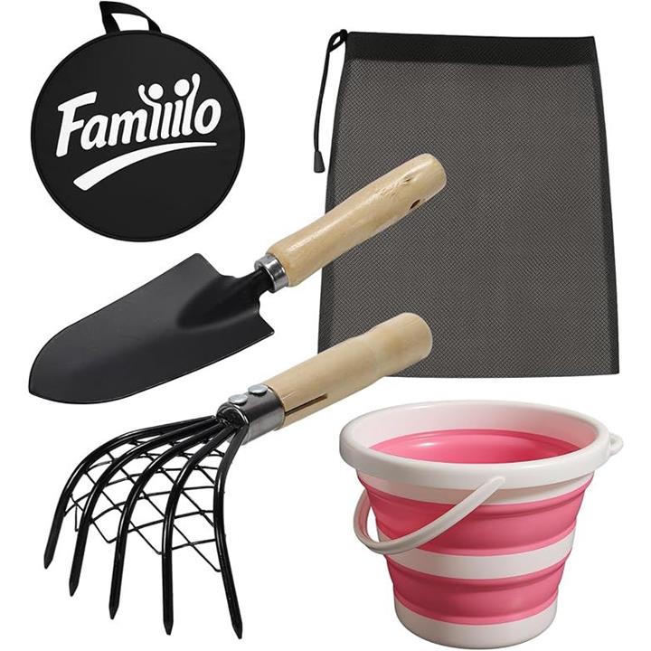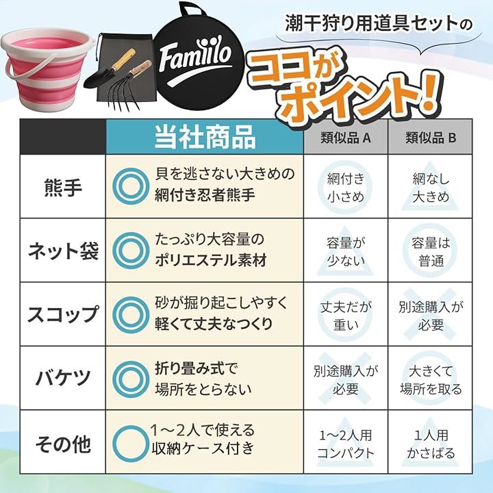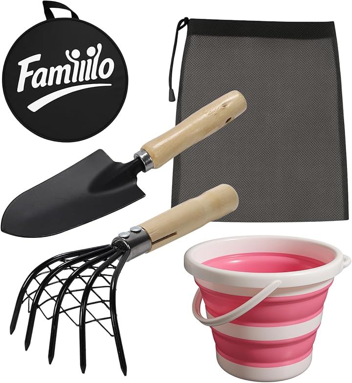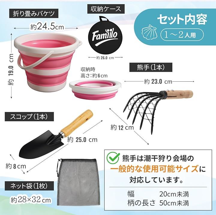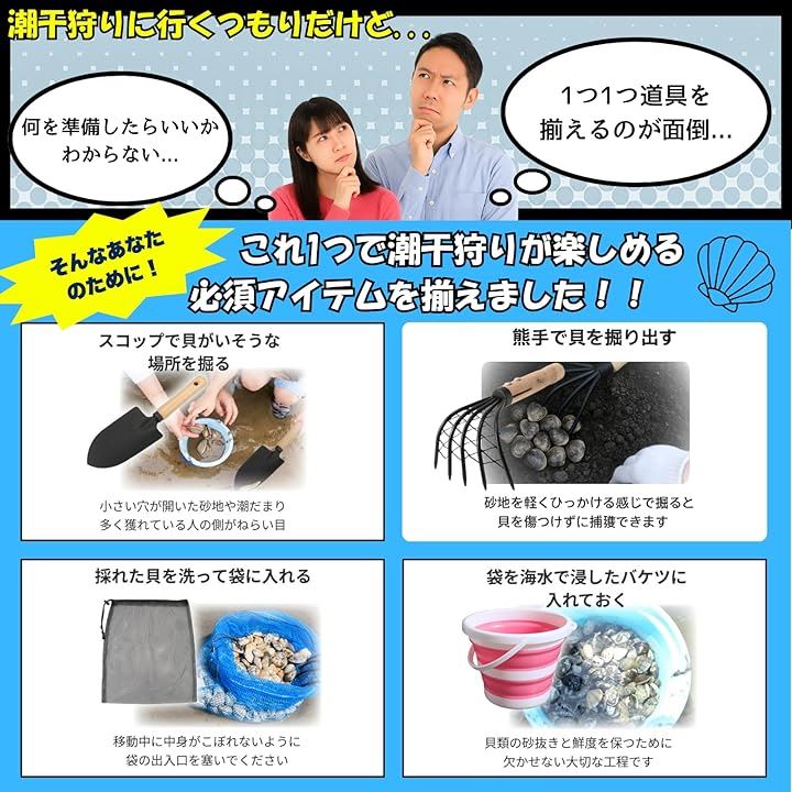 収納袋付き 潮干狩りセット 折り畳みバケツ 熊手 スコップ 貝掘り アサリ ハマグリ 家族連れ