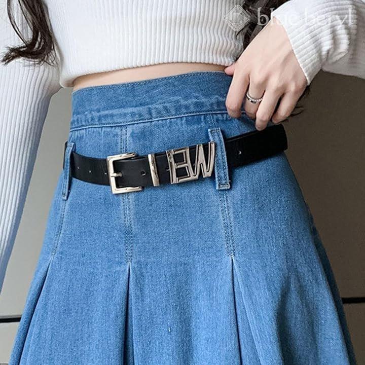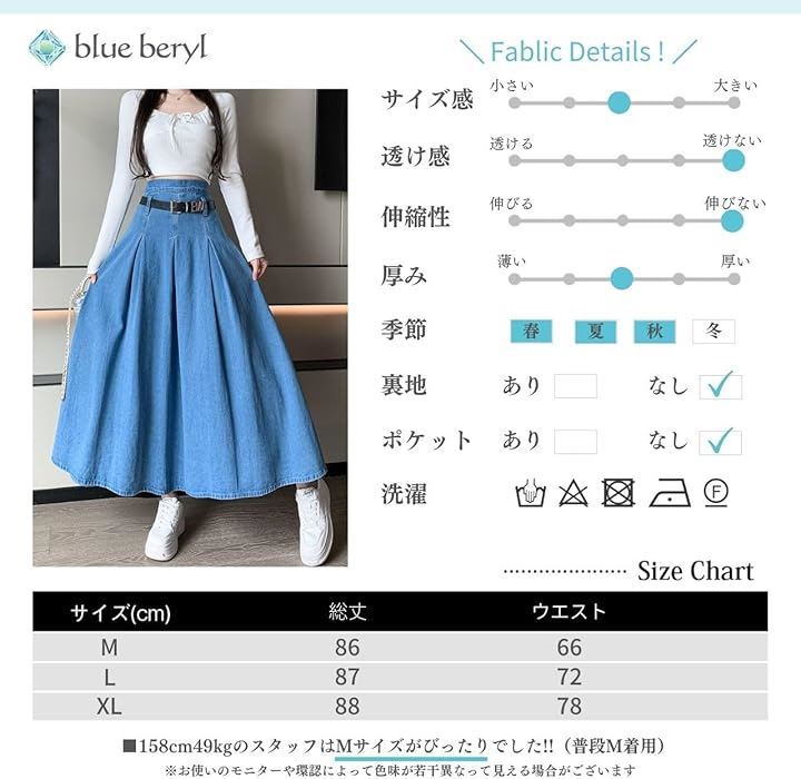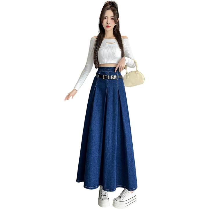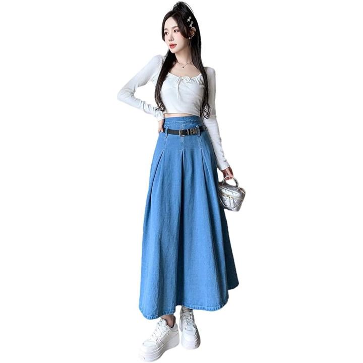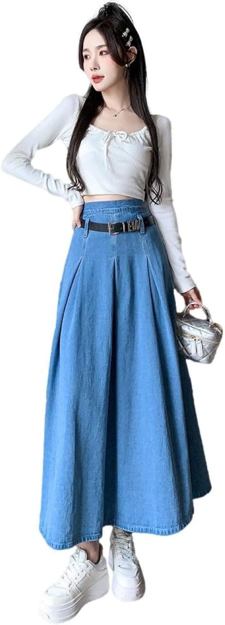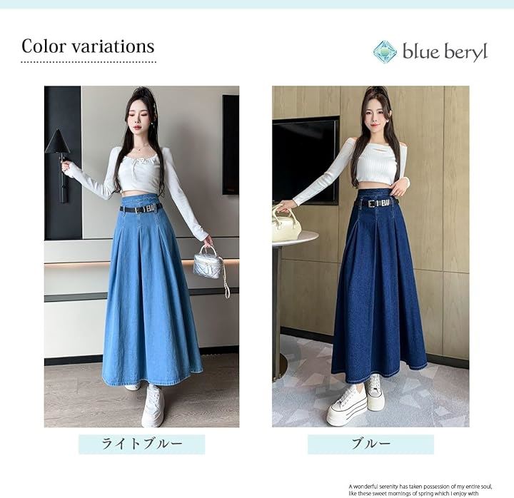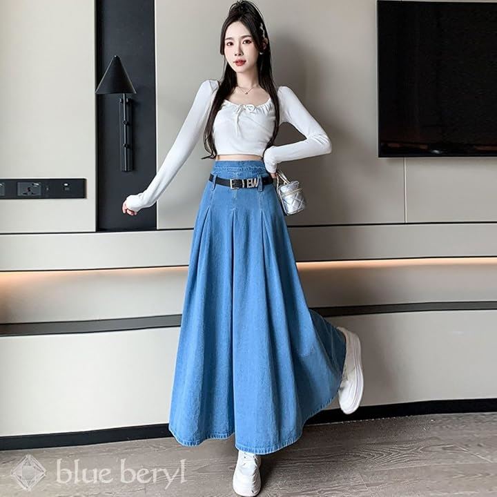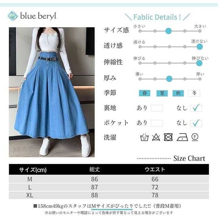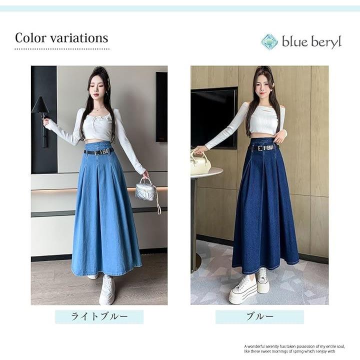 ブルーベリル ロングデニムスカート レディース ギャザー Aライン ハイウエスト バックファスナー ベルト付 カジュアル 上品 軽い