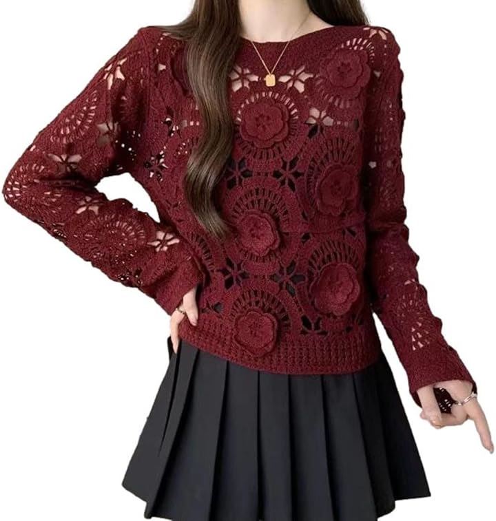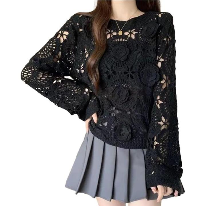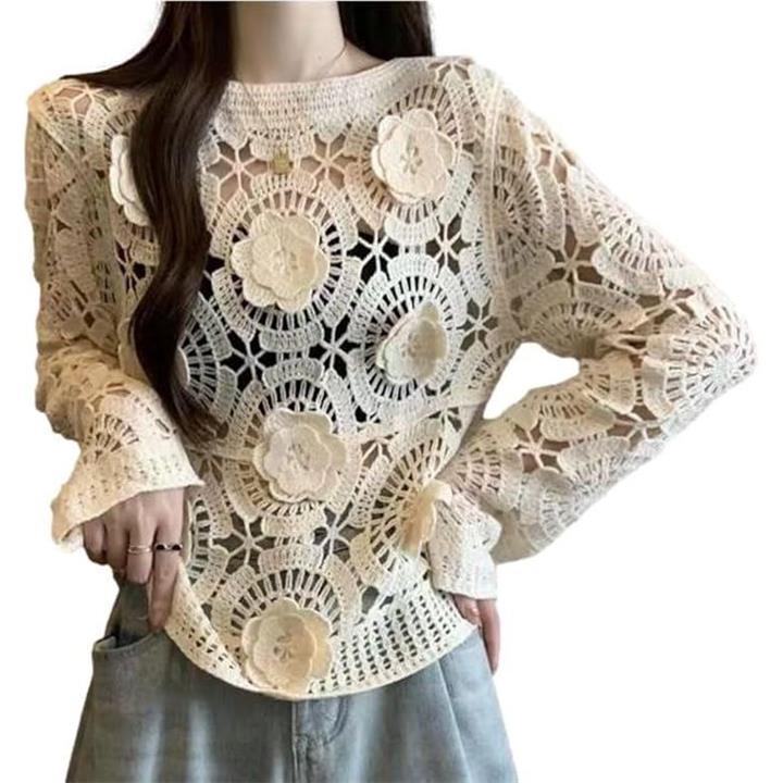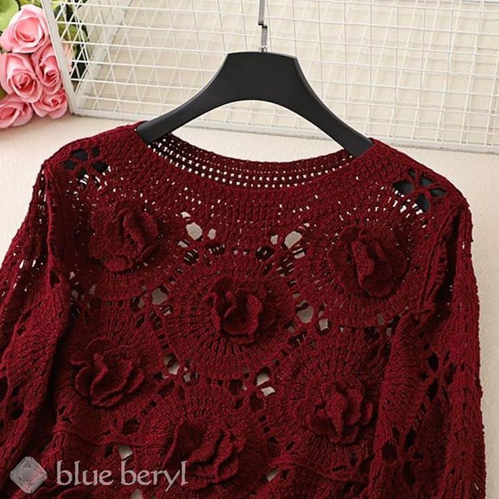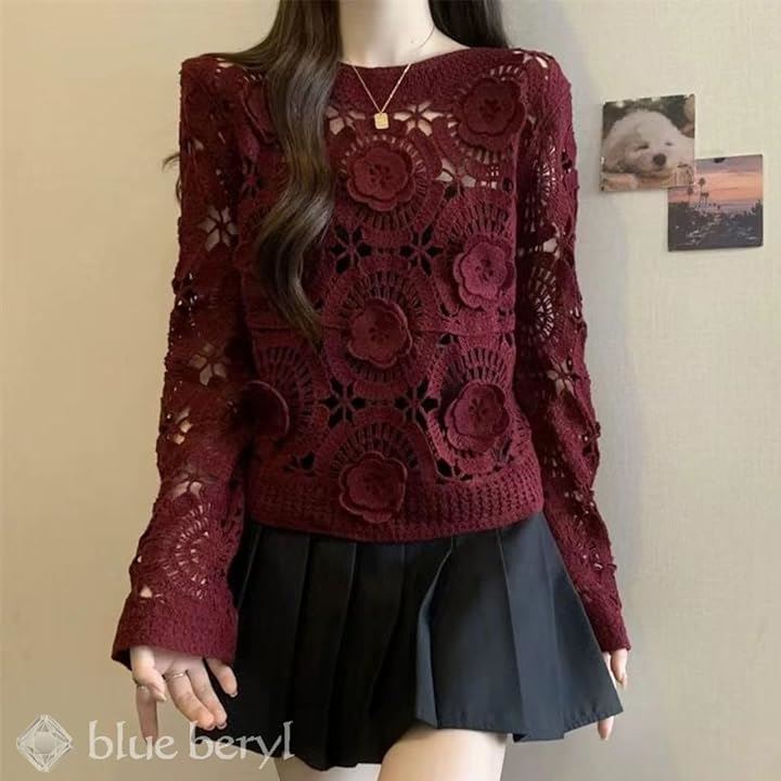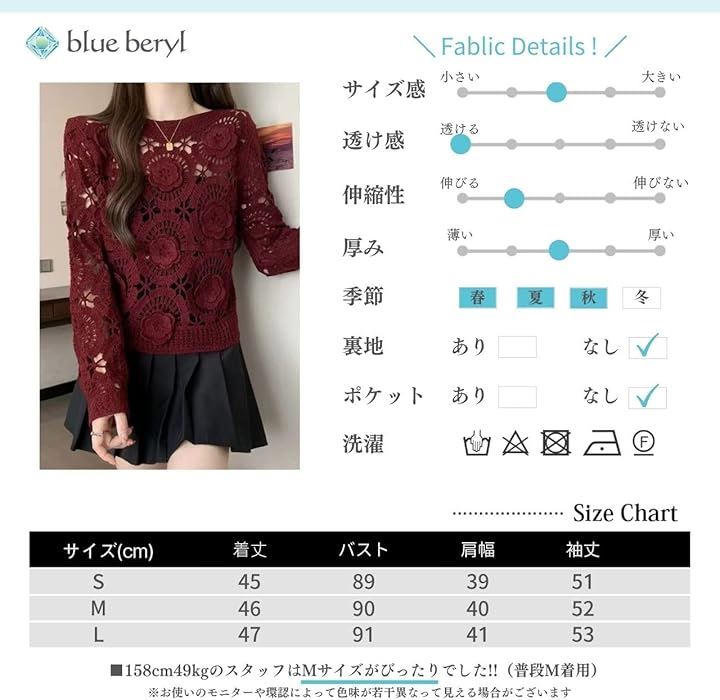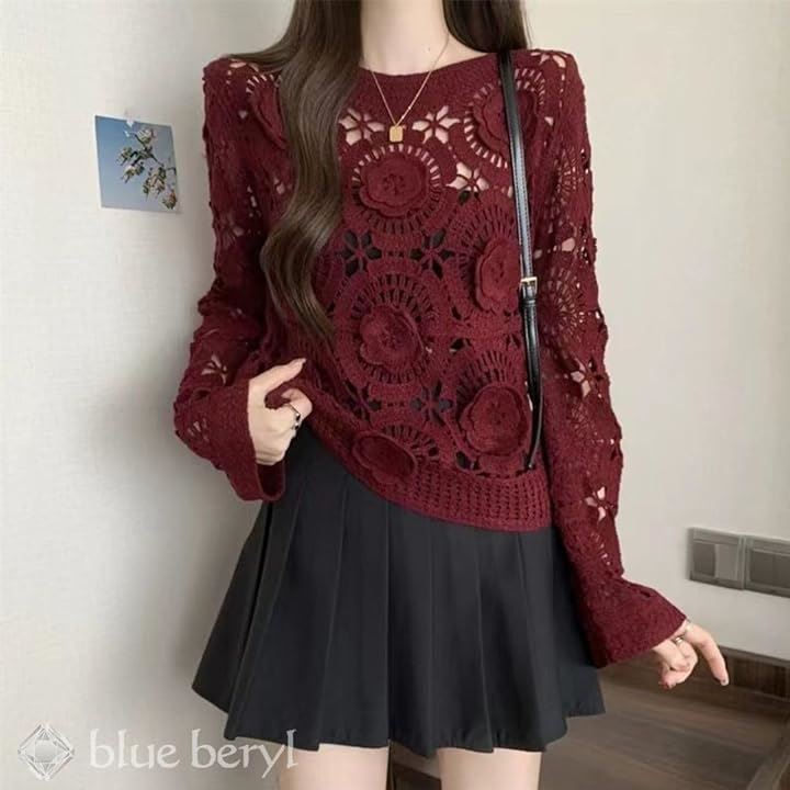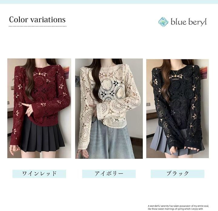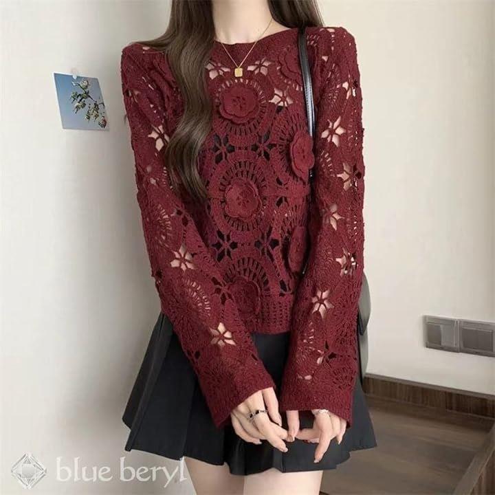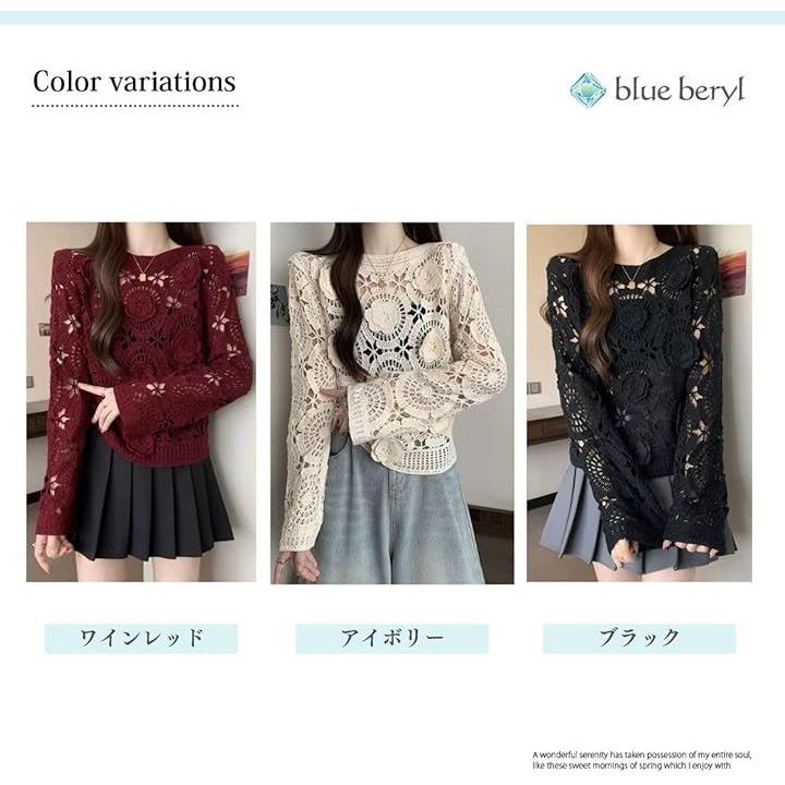 [blue beryl] 透かし編みレースプルオーバー レディース サークルレース 長袖 フレアスリーブ レイヤード ゆるシルエット フェミニン BB073 |