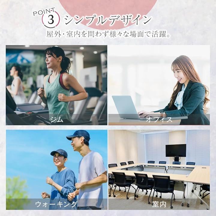 ジム、オフィス、室内、ちょっとした外出や買い物、散歩など、幅広い場合が使えます。