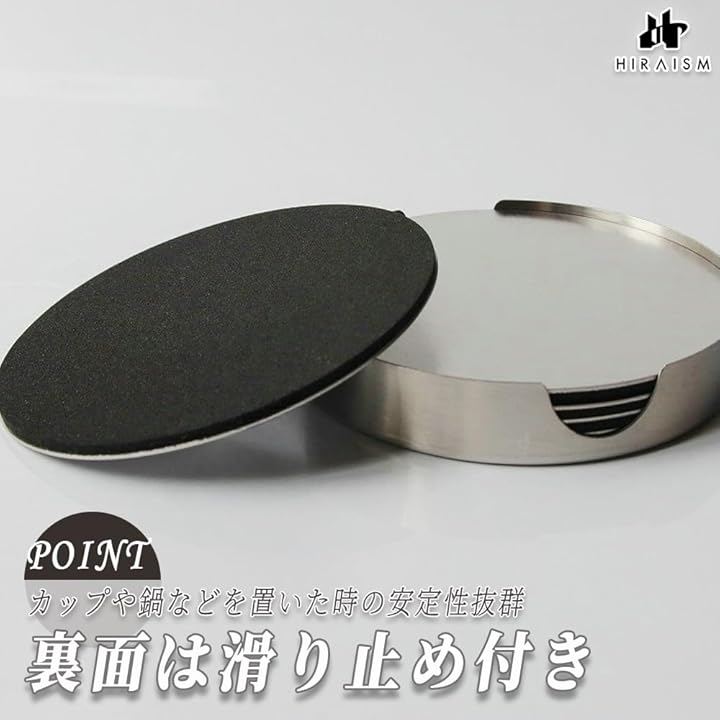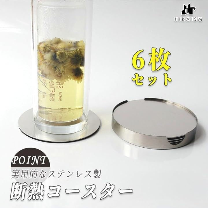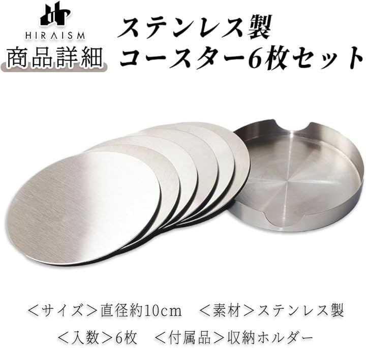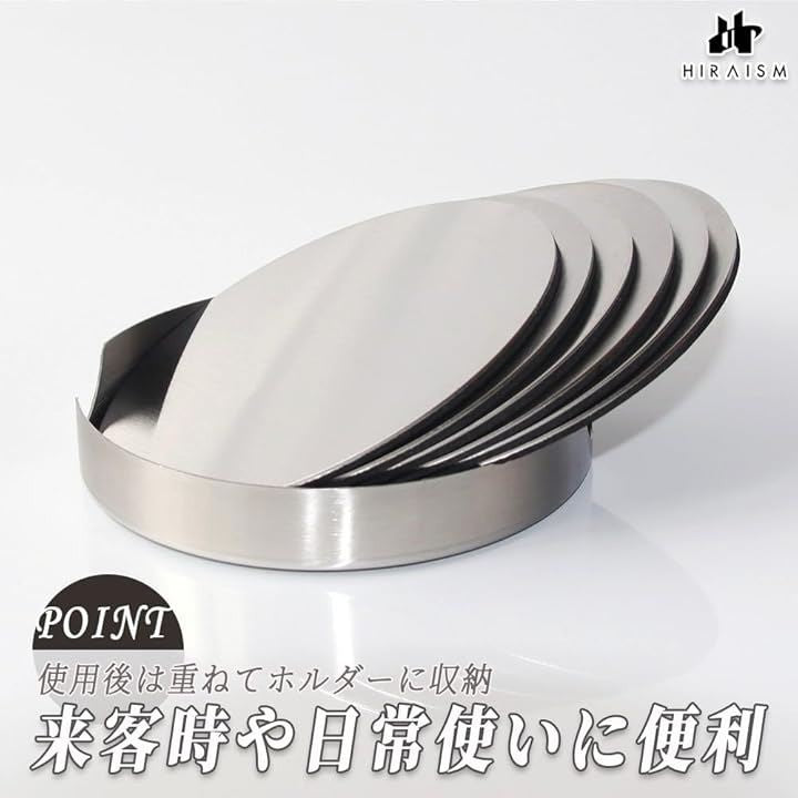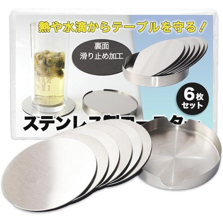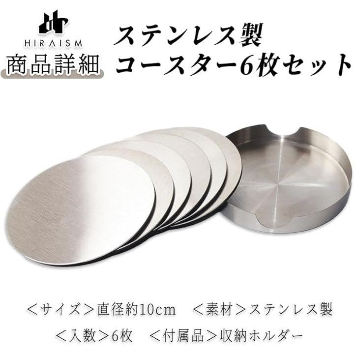 ステンレス製コースター 直径10cm 耐熱 防水 軽量 収納ホルダー付き 6枚セット