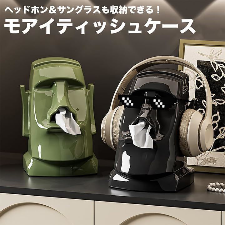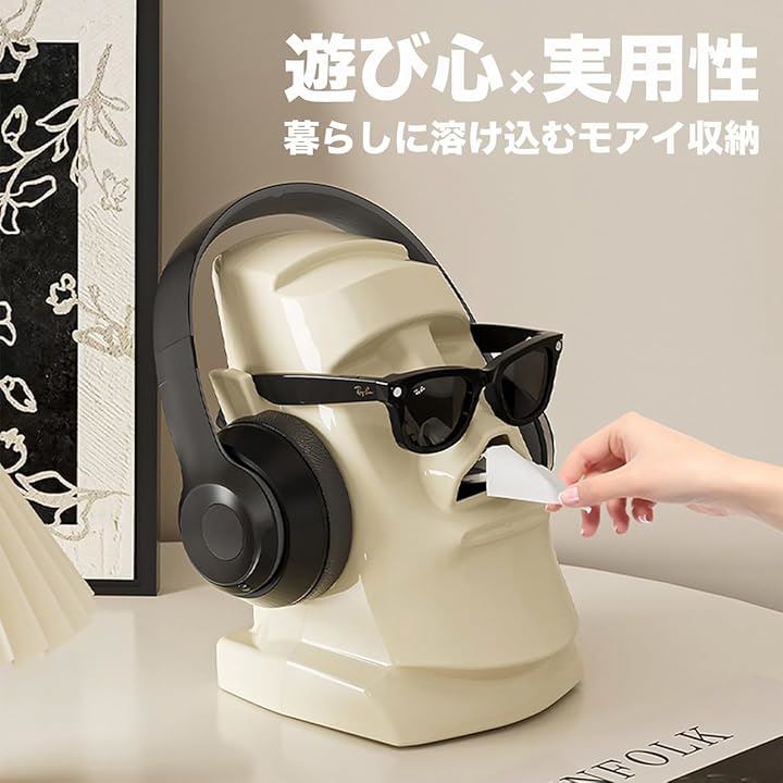 モアイ ティッシュケース 収納 ペーパー ボックス スタンド モアイ像 おもしろ 面白い 卓上 オブジェ 置物 ヘッドホン サングラス メガネ