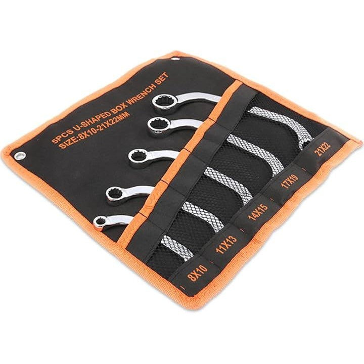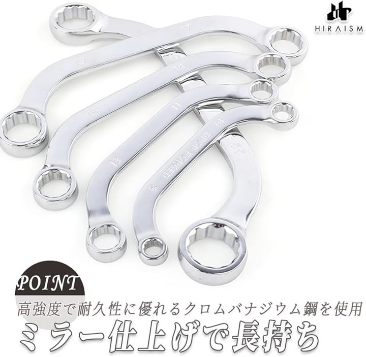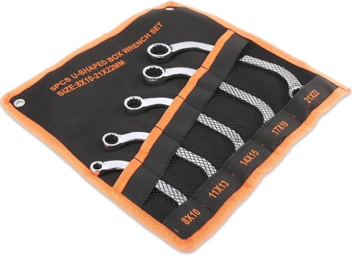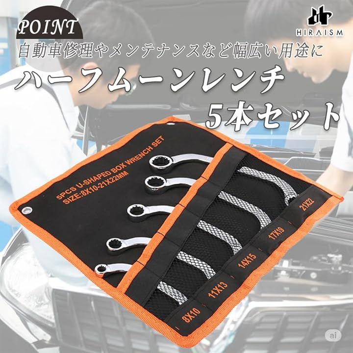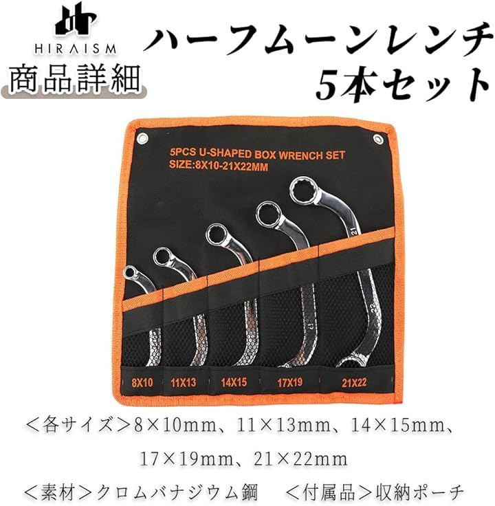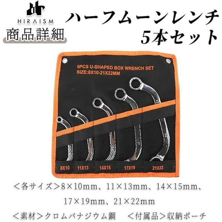 ハーフムーンレンチ メガネレンチ リバーシブル 半月型 5本セット 収納ポーチ付き