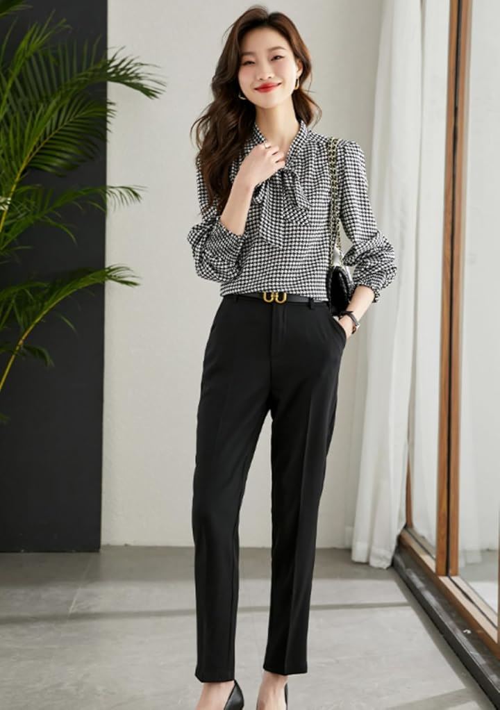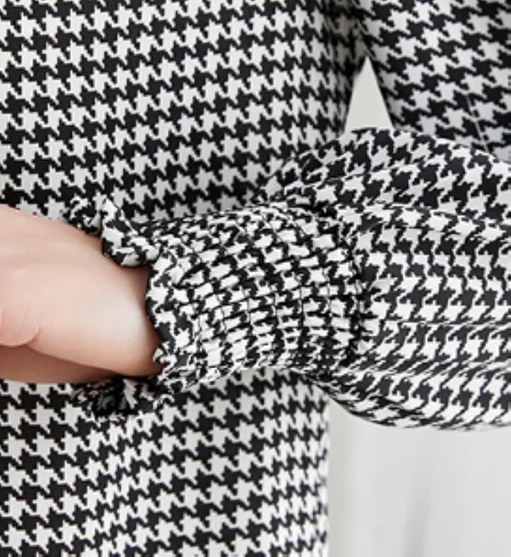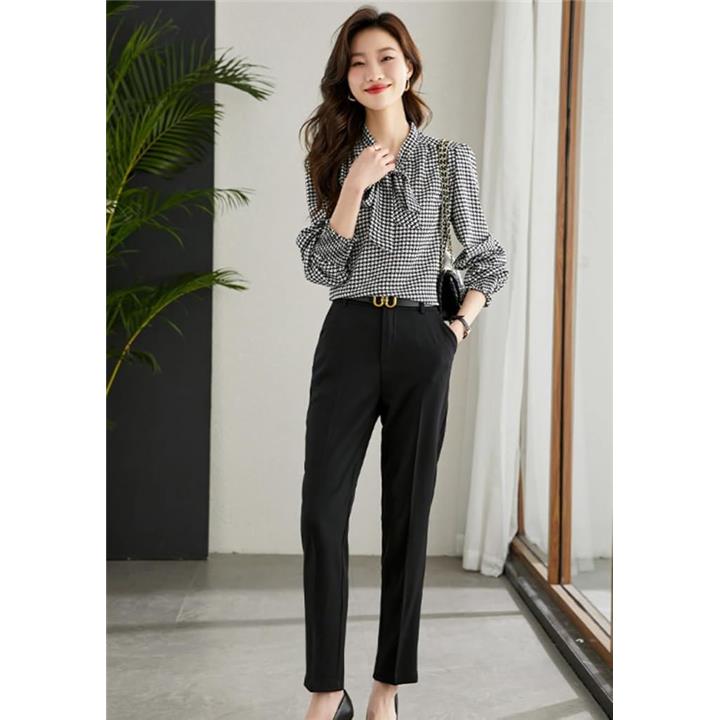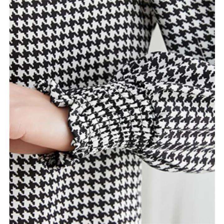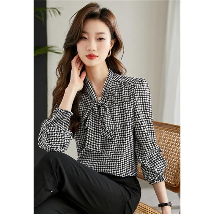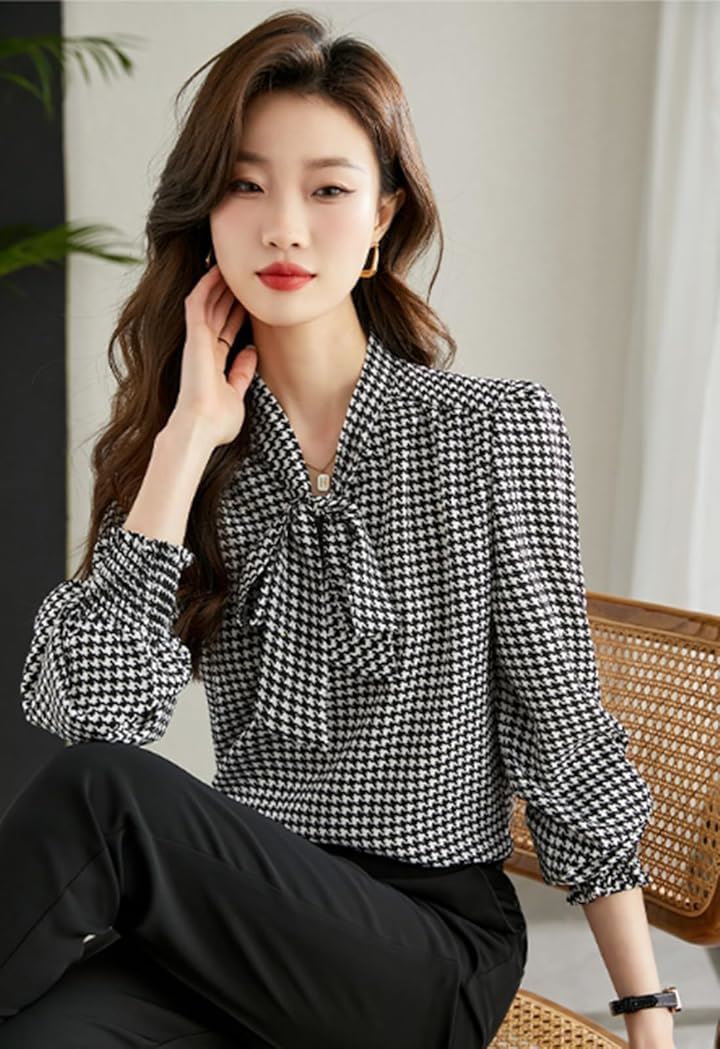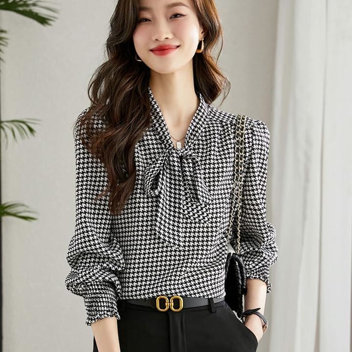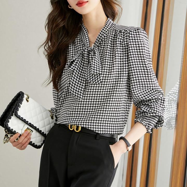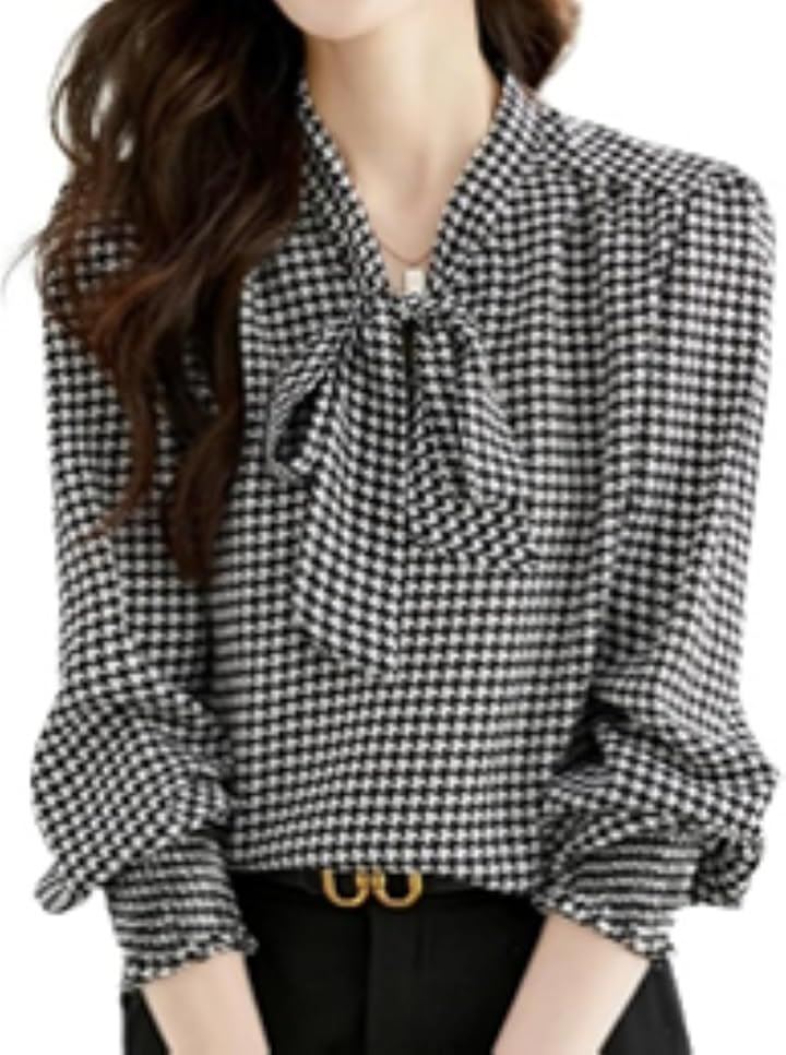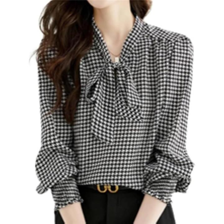 レディース トップス ブラウス シャツ ボウタイ リボン 長袖 千鳥 格子 柄 韓国 きれいめ おしゃれ 人気 定番 とっぷす ぶらうす しゃつ ロング スリーブ シンプル 個性 的 かわいい カワイイ 可愛い