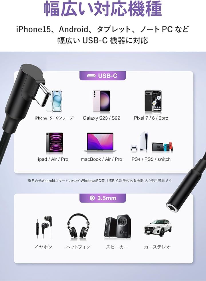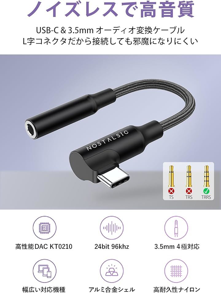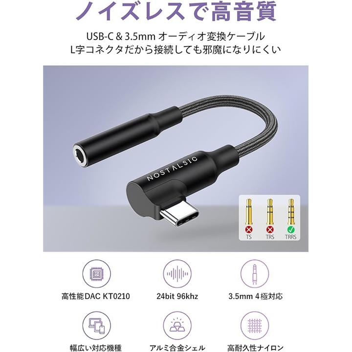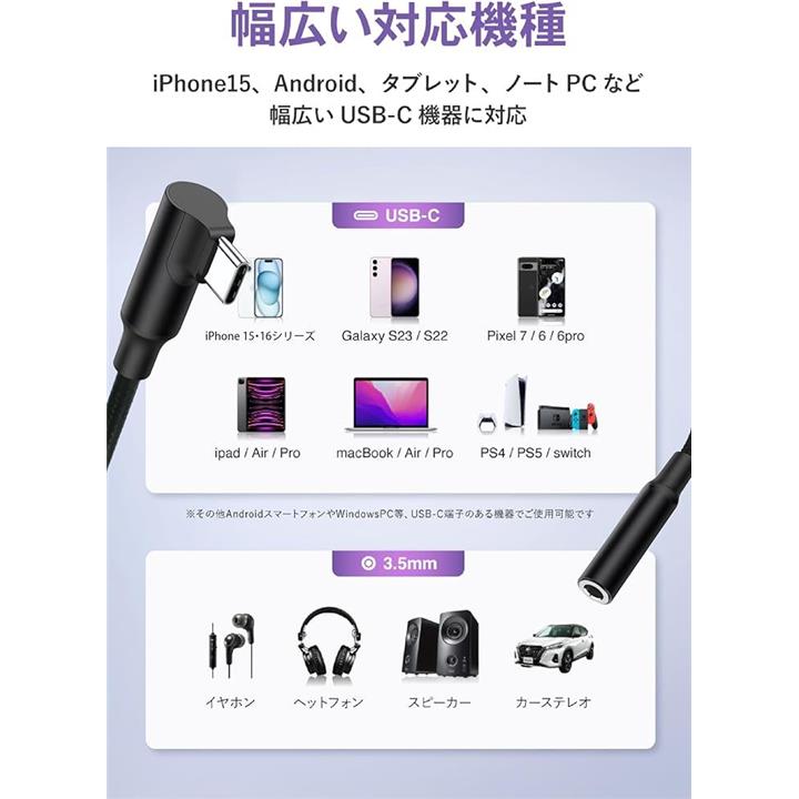 互換品 USB C & 3.5 mm イヤホンジャック変換 オーディオアダプタ DAC搭載 24bit/96KHz対応 ハイレゾ音質 TRRS/4極 ナイロン編み L字型 コネクタ 音量調節/通話/音楽対応 iPhone15 16 シリーズ/iPad C機器に対応