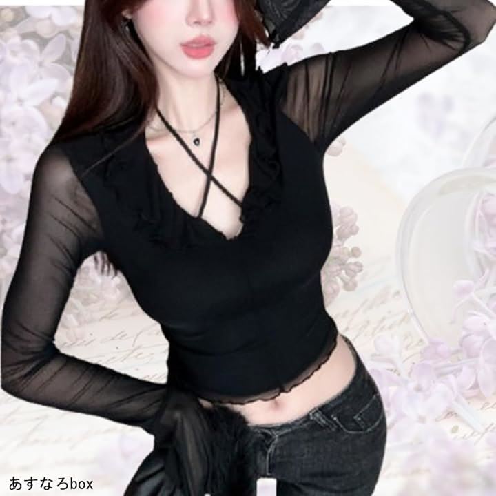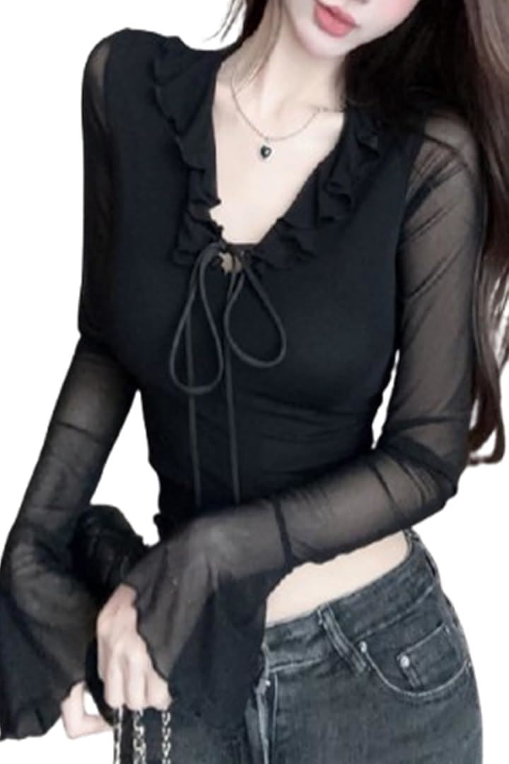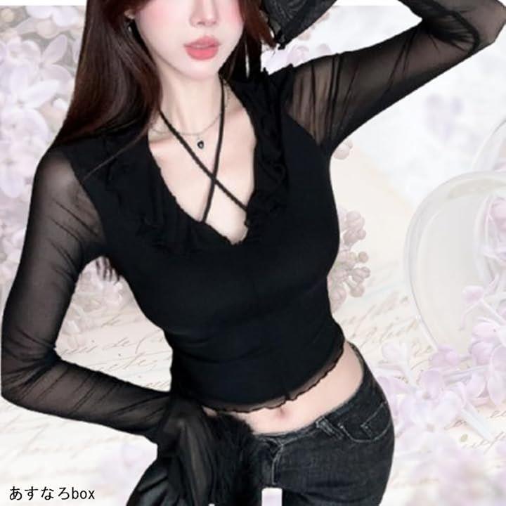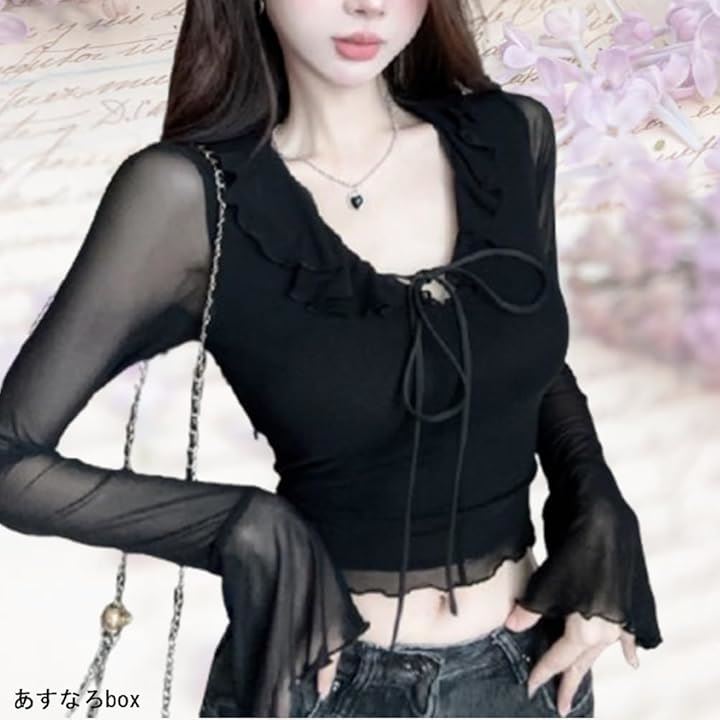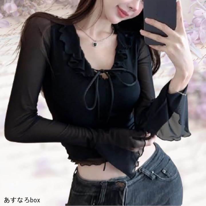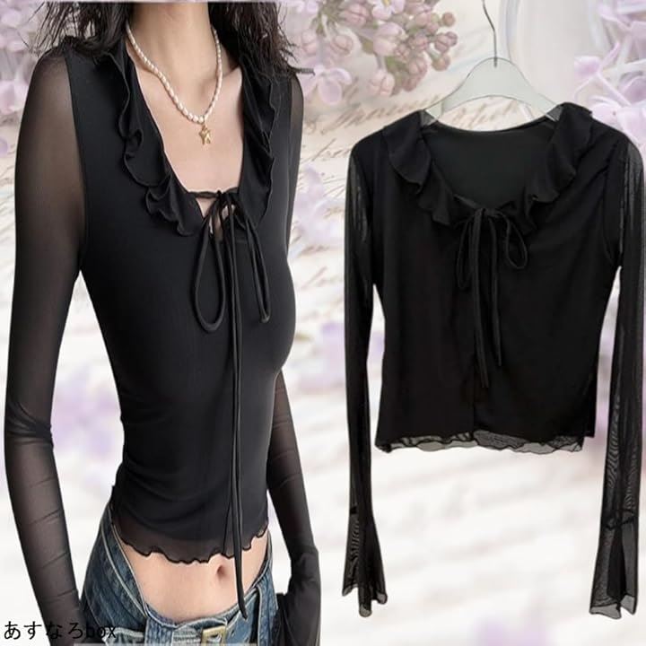 トップス レディース 長袖 シアー袖 リボンタイ フリルネック 透け感 無地 体型カバー 通勤 きれいめ オフィス 着やせ
