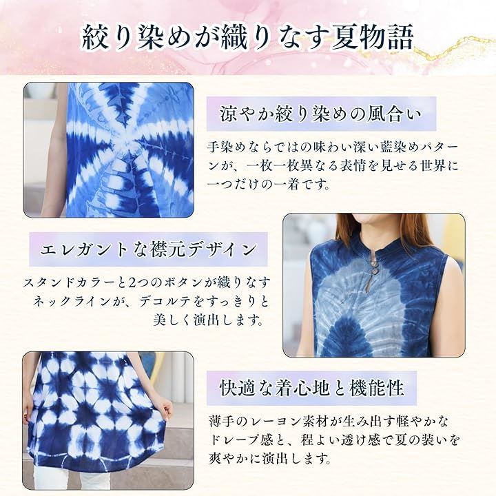 [藍染めアートが織りなす夏物語] 伝統的な絞り染めの技法を現代的にアレンジした、アーティスティックなチュニック。