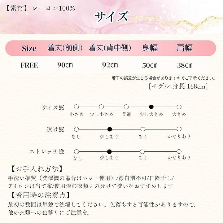 [快適な着用感とお手入れ]「サイズ」フリーサイズ(着丈:90cm、身幅:50cm、肩幅:38cm「素材」レーヨン100%「カラー」3種のデザイン:フローラル/クリスタル/ウェーブ「お手入れ方法」手洗い推奨(洗濯機の場合はネット使用) 他の衣類との分けて洗いをおすすめします。