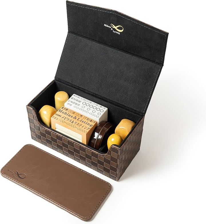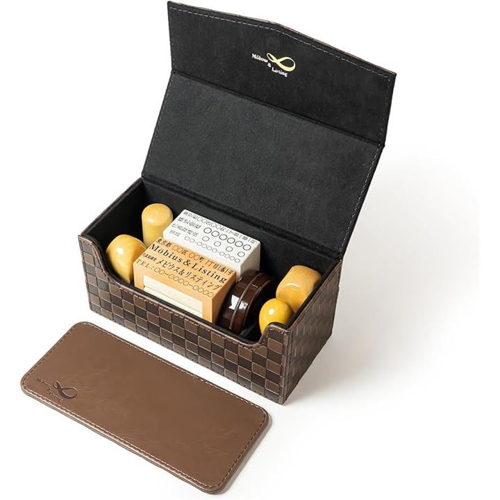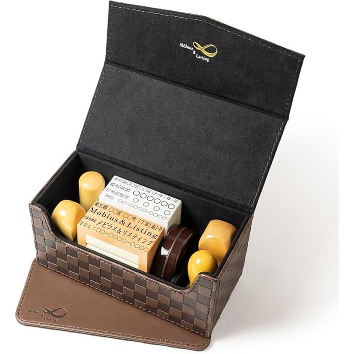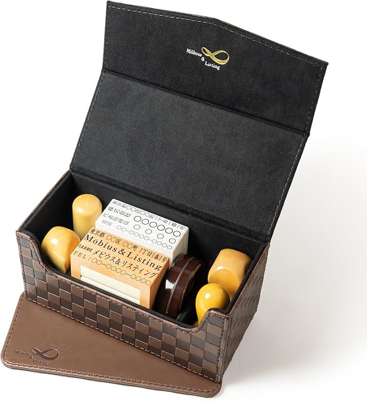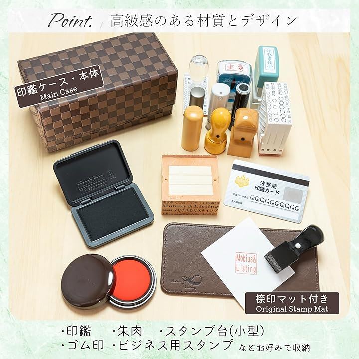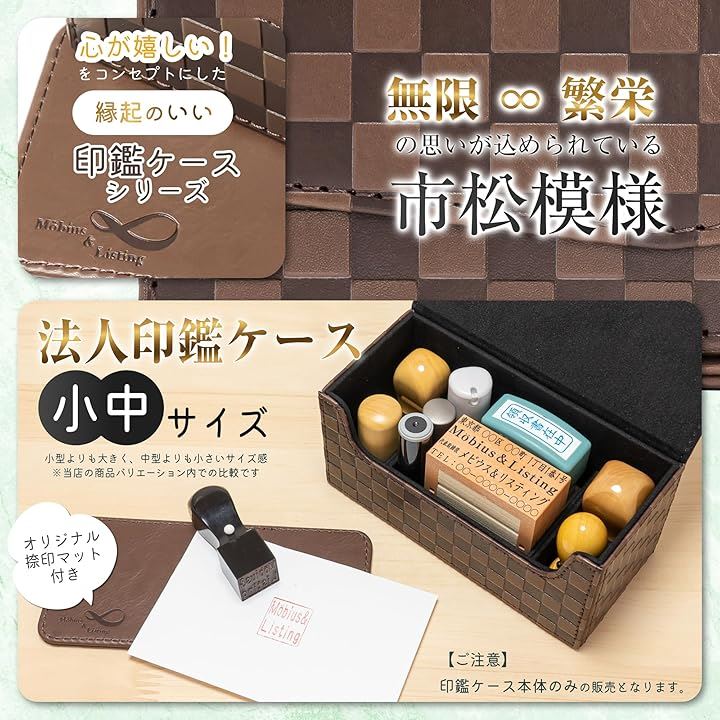 Möbius 市松模様で縁起のいい・法人 印鑑ケース シリーズ・小中型サイズ ハンコケース ゴム印ケース 印箱 判子ケース 法人用 会社 実印 銀行印 角印 認印 住所印 など 4本 朱肉 スタンプ台 捺印マット付き No.11