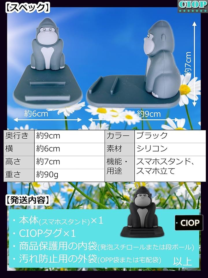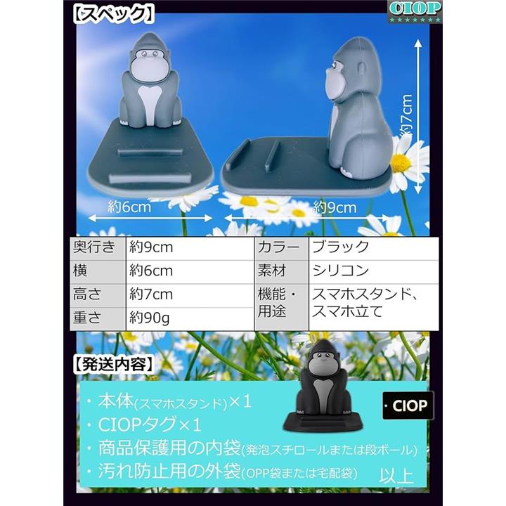「サイズ」:奥行き9cmx横6cmx高さ7cm 「重さ」:約90g 「材質」:シリコン(生産国:中国) 「機能・用途」:スマホスタンド、スマホ立て