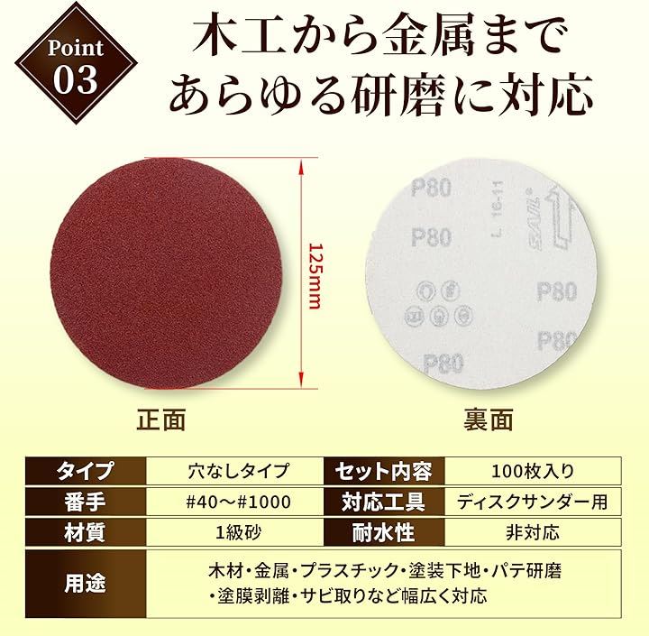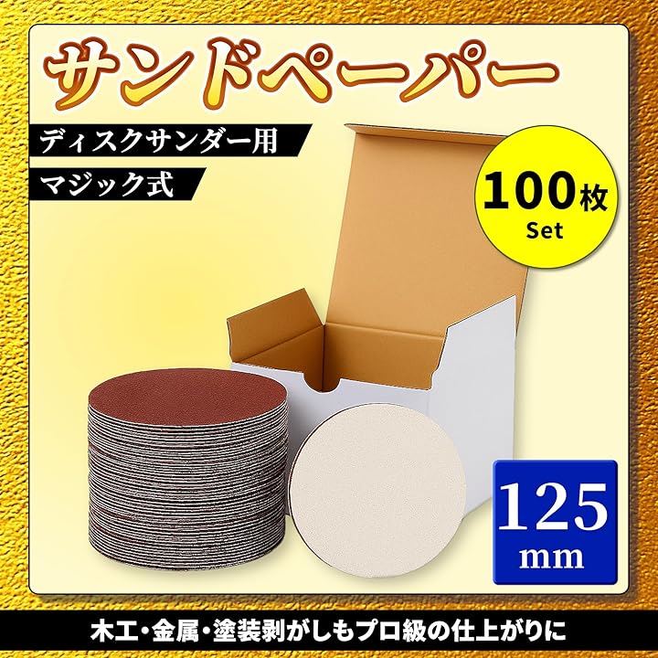 商品仕様 : ・タイプ:マジック式 サンドペーパー(穴なしタイプ) ・セット内容:100枚入り ・サイズ:125mm ・粗目~極細目まで全13種類 ・対応工具:ディスクサンダー用 ・材質:1級砂 ・耐水性:非対応