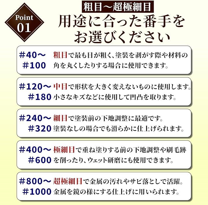 豊富な番手 : 粗目から極細目まで13種類を揃え、荒削りから仕上げまで自在に使い分け可能。