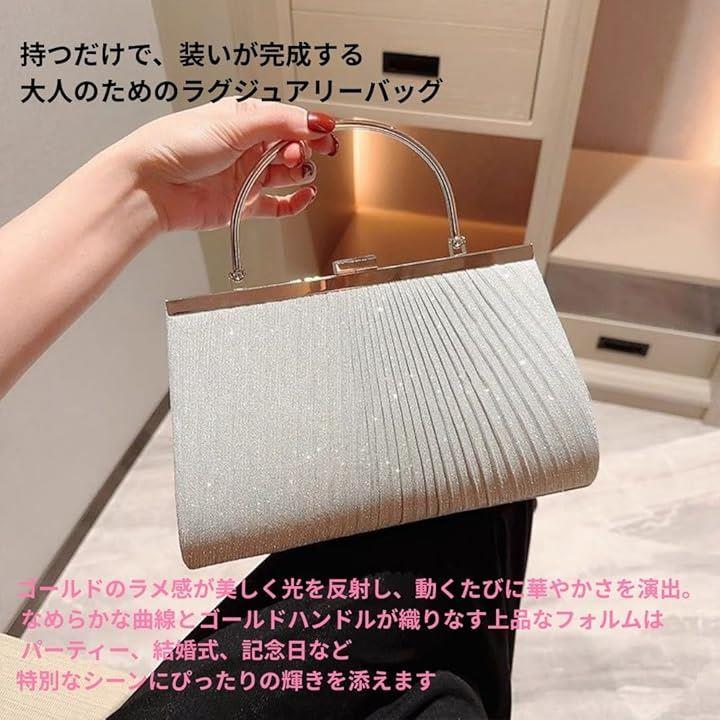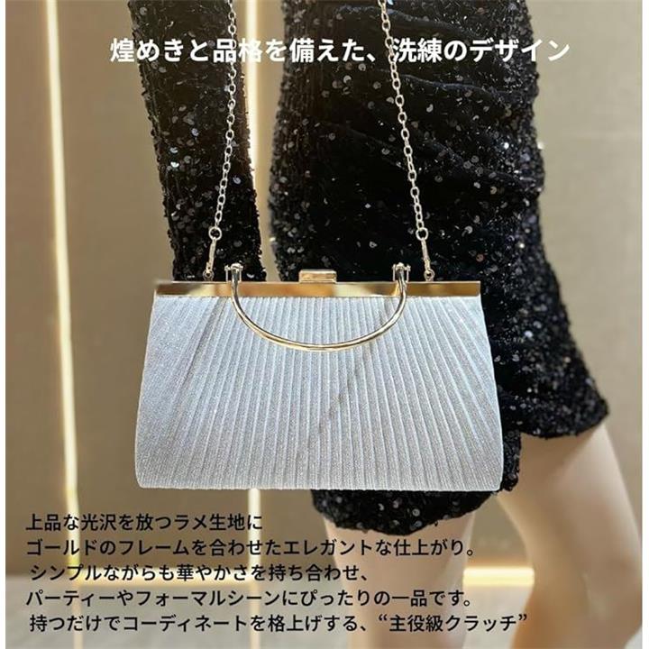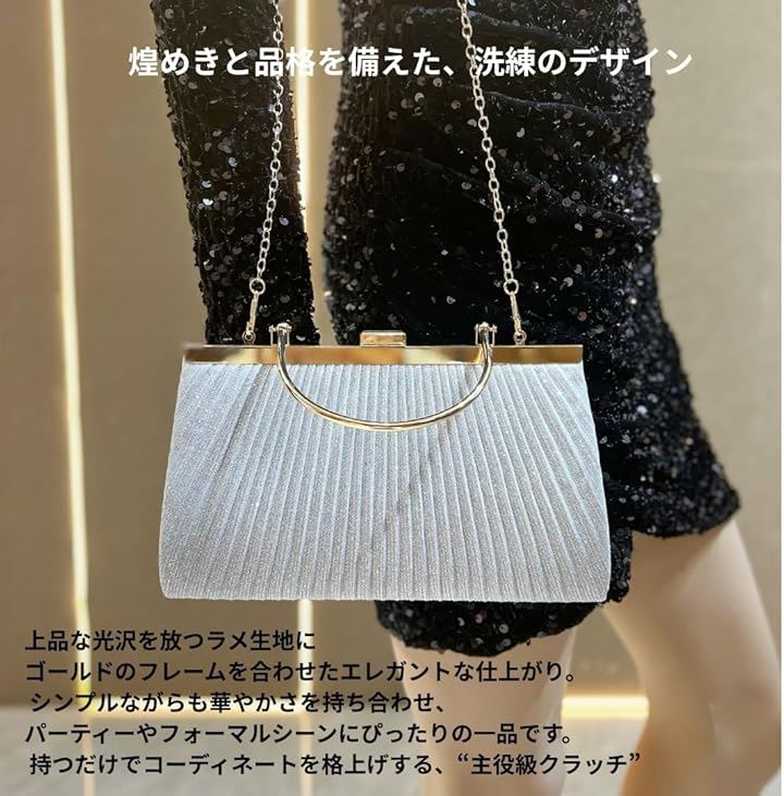 「上品なきらめきと実用性を兼ね備えたクラッチバッグ」光を受けて繊細にきらめくラメプリーツ生地を使用した、26cmx15cmx5.5cmのコンパクトバッグ。