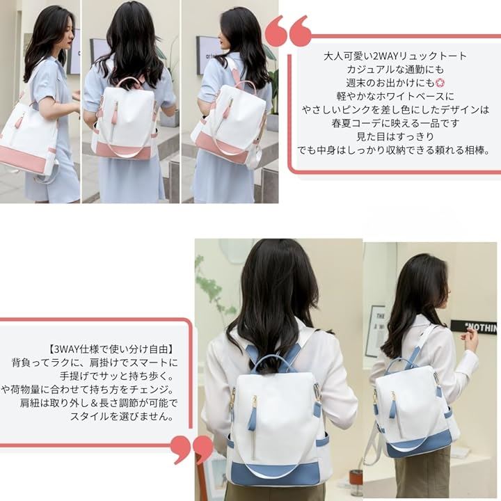 リュックスタイルでは両手が空いて移動がスムーズ、ショルダーでは斜め掛けで動きやすく、手提げではきちんとした印象にも。