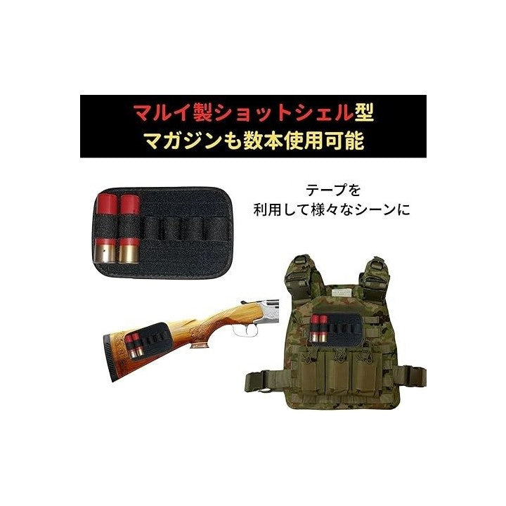 マルイ製ショットシェル型マガジンも数発取り付ける事ができ、収納やタクティカルベスト等に面ファスナーを利用して取り付ける事ができます。