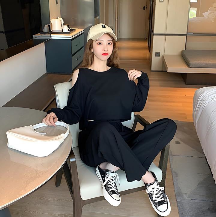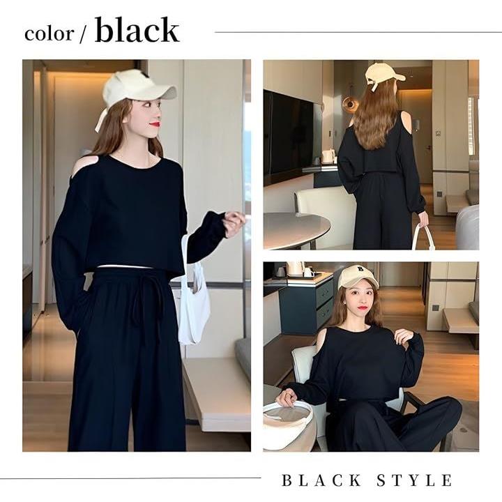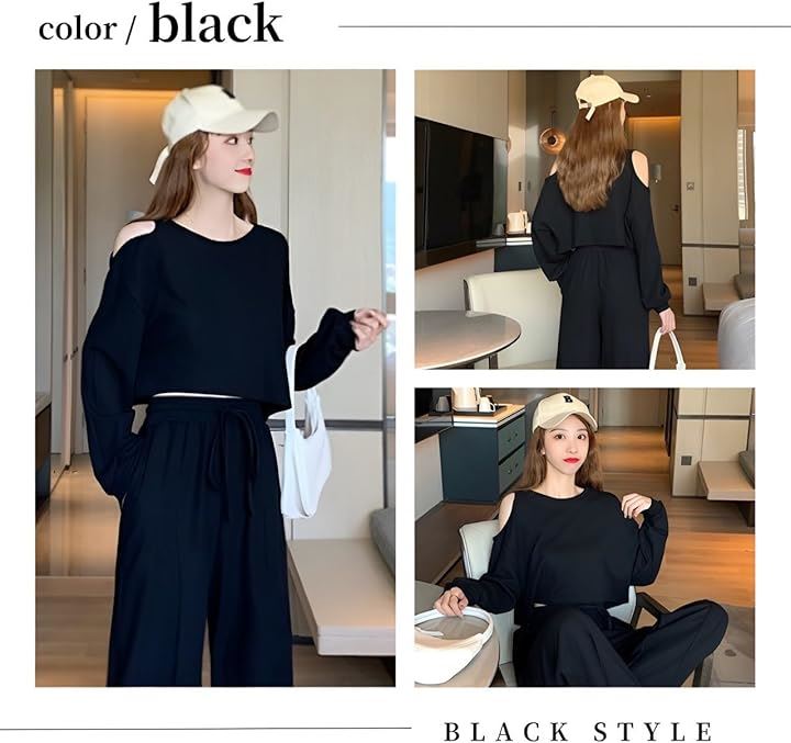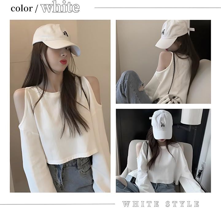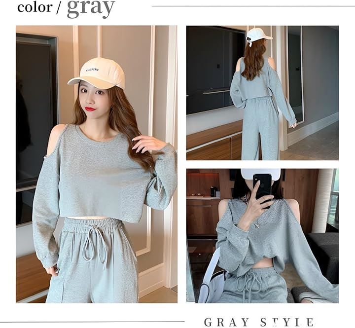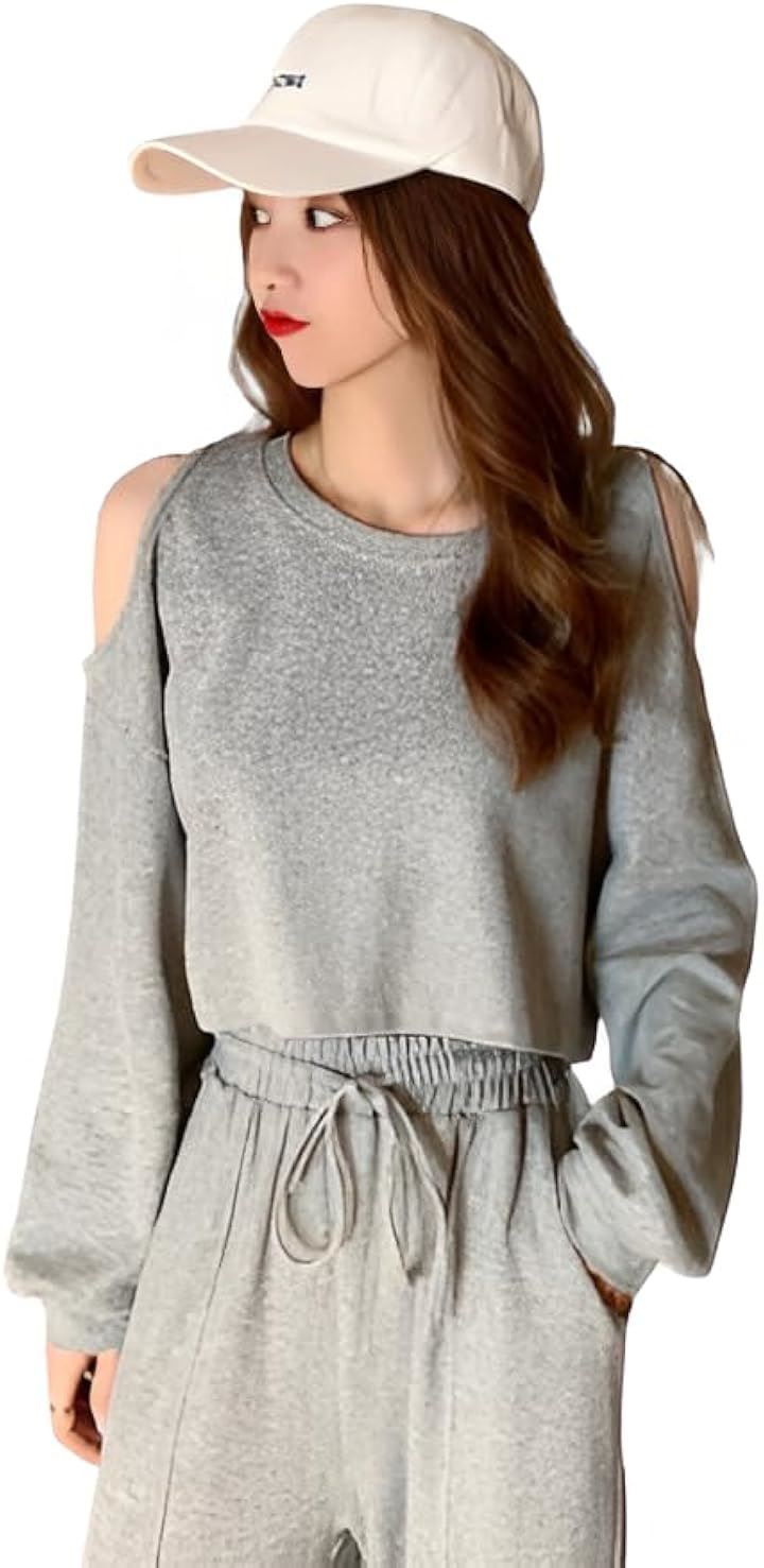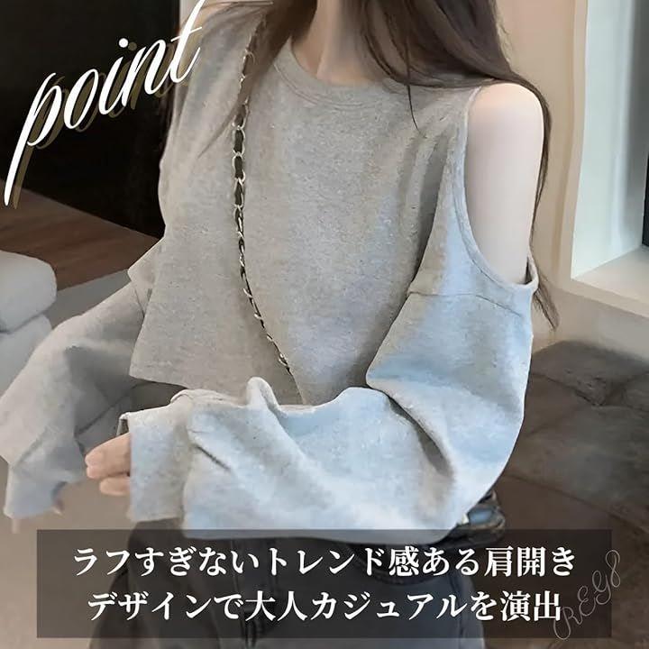 レディース オフソルダー トップス 肩開き Y2K ショート丈トレーナー 長袖 プルオーバー クルーネック シンプル カジュアル 無地