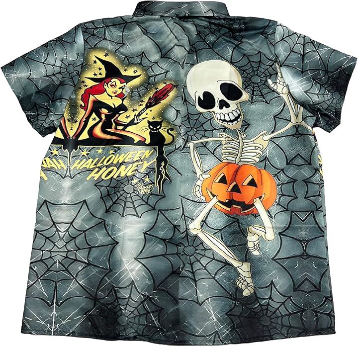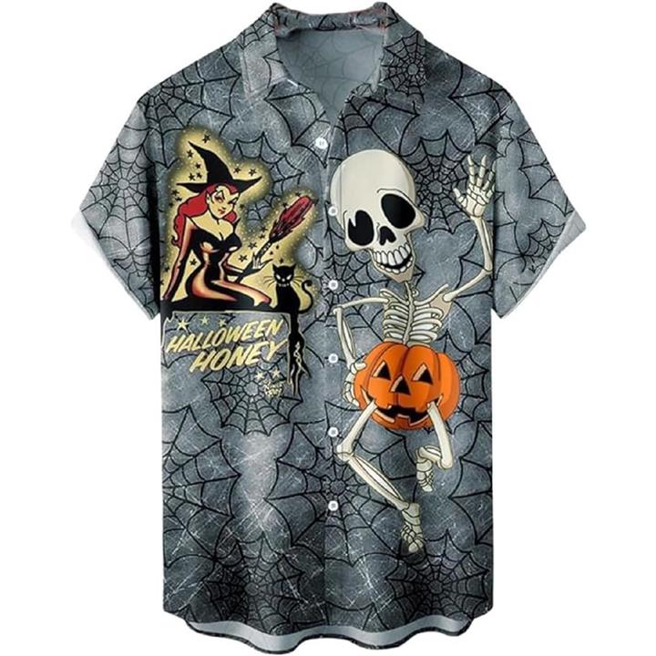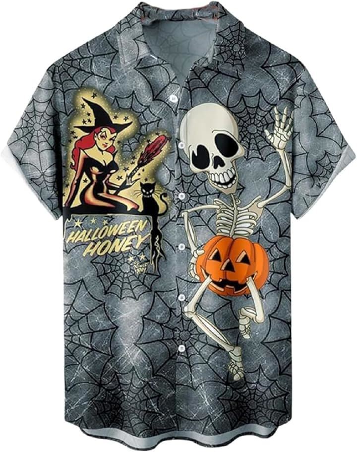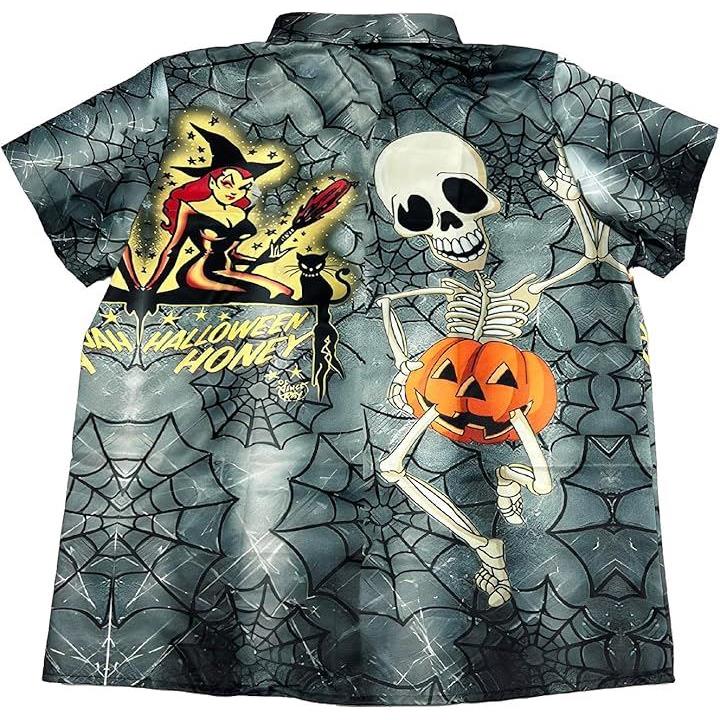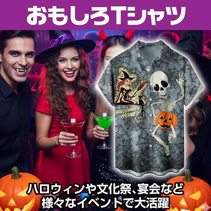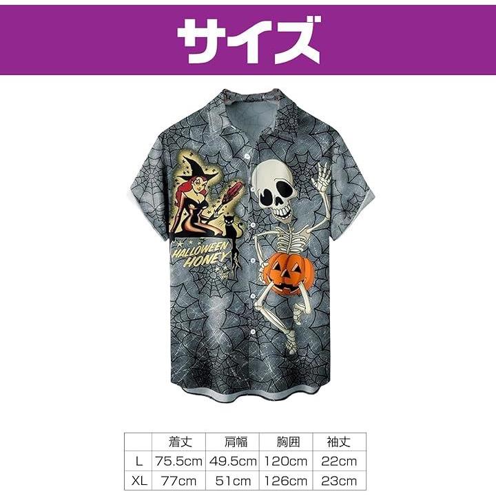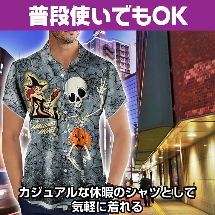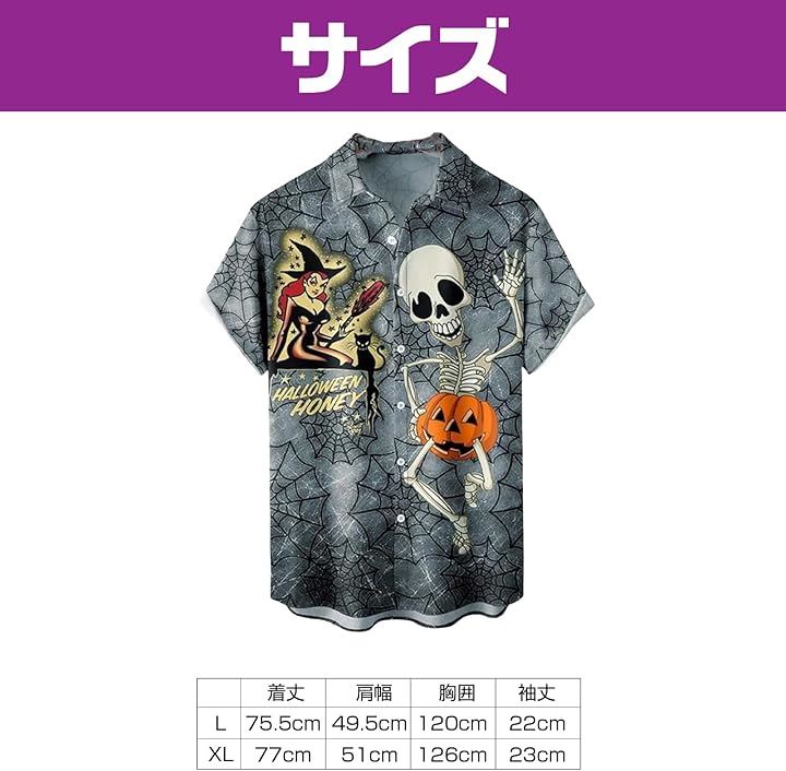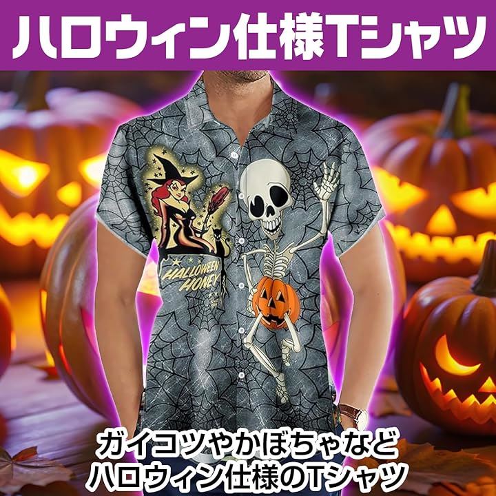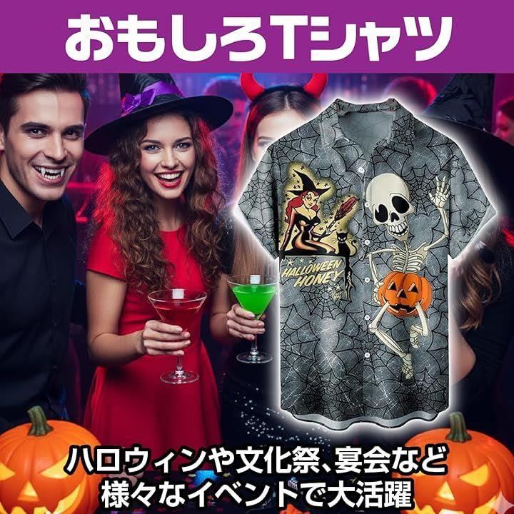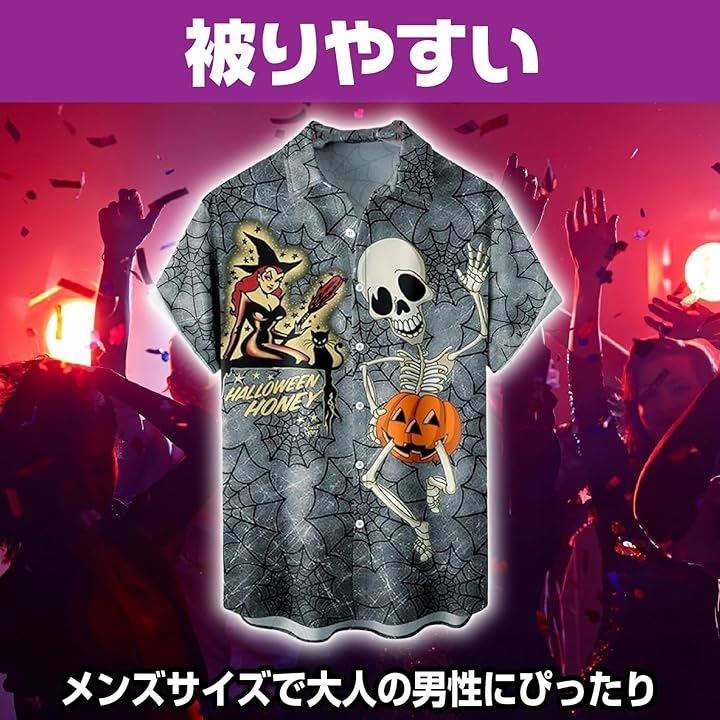 ハロウィン シャツ メンズ 開襟 カボチャ 魔女 ガイコツ プリントシャツ ゆったり 軽量 通気性 コスチューム トップス