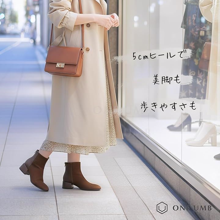 「5cmヒールで叶える美脚x歩きやすさ」 安定感のある約5cmチャンキーヒールは、美脚効果を狙いつつ長時間歩いても疲れにくい仕様。