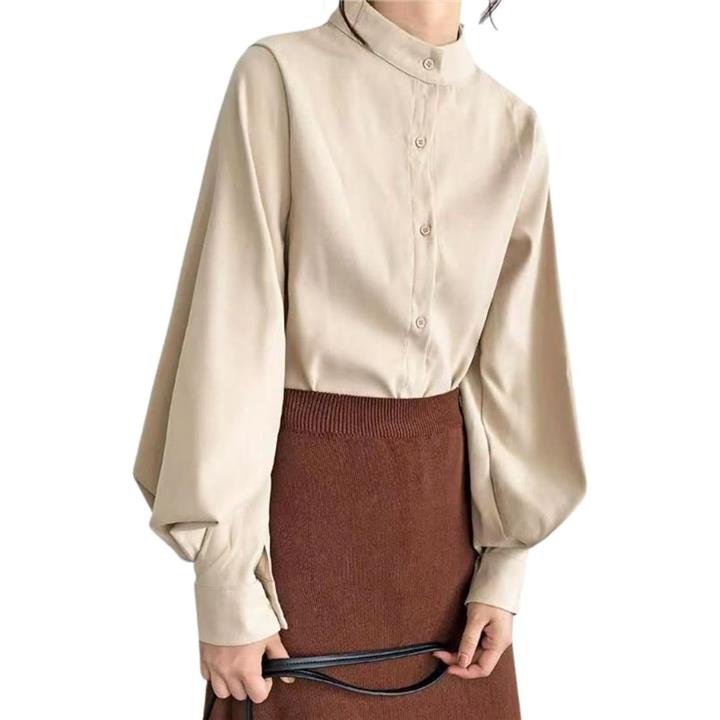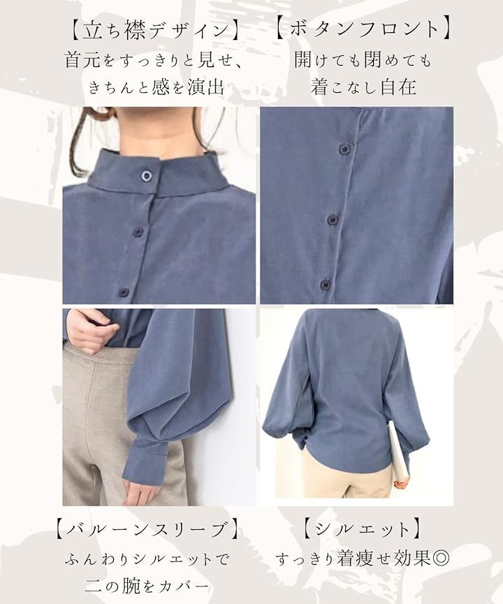 「立ち襟ブラウスレディース上品で知的な印象」 首元をすっきり見せる立ち襟デザインは、清楚で洗練された雰囲気を演出。