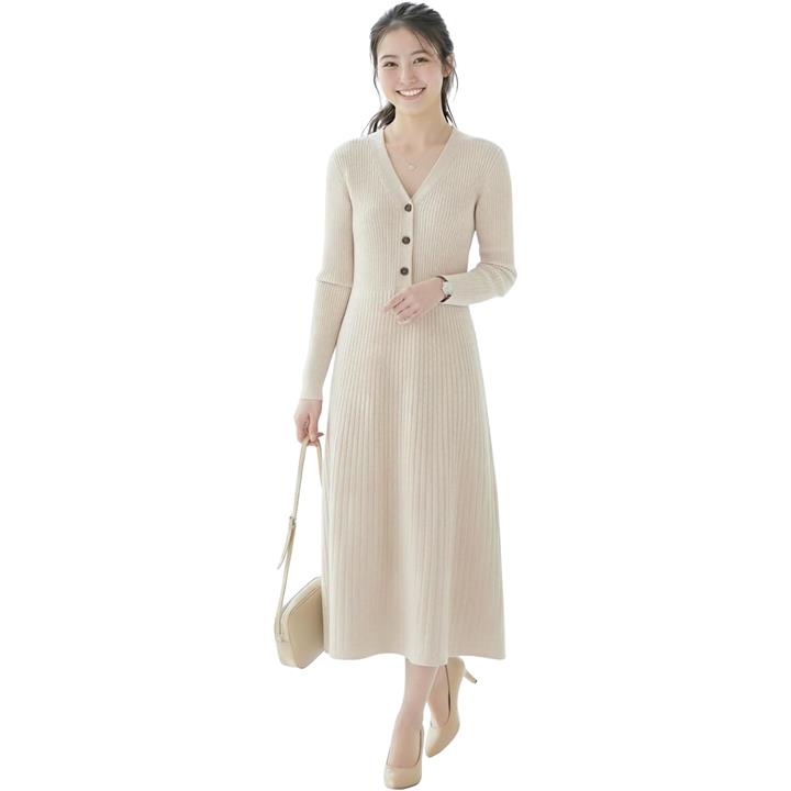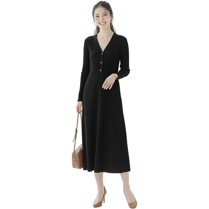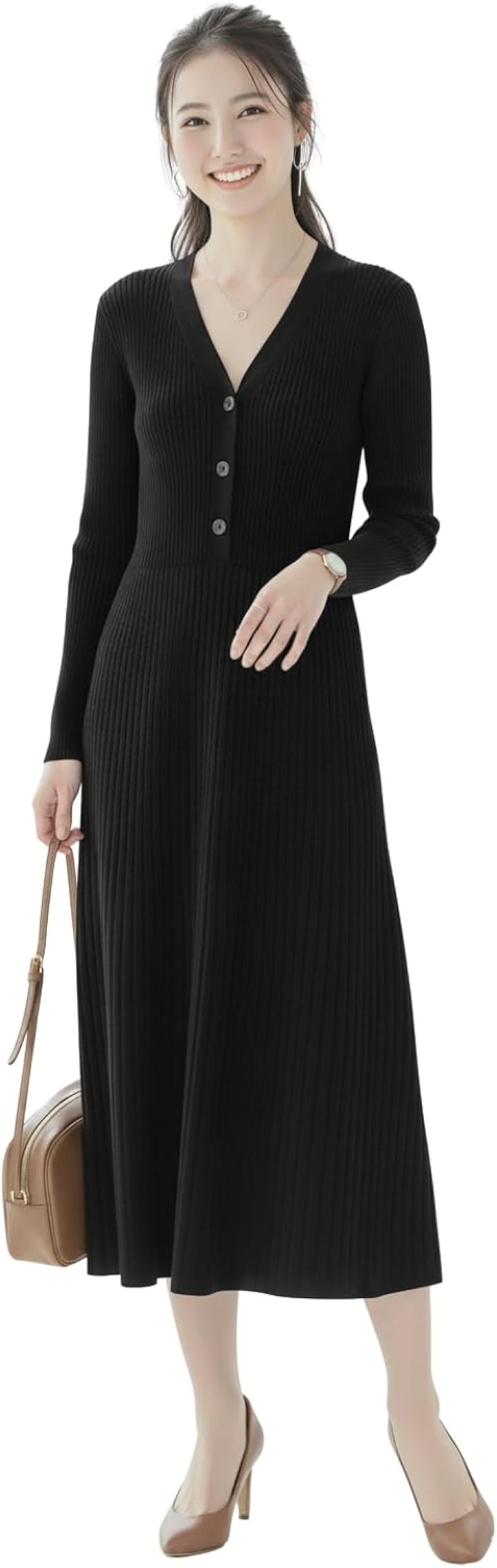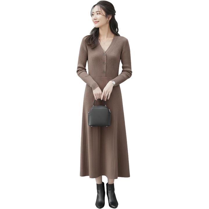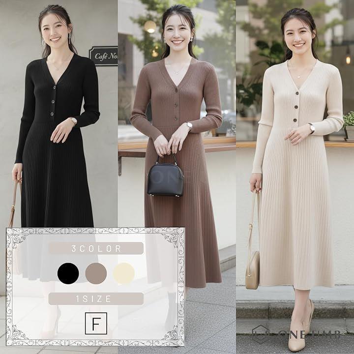 ニットワンピース ロング 長袖 vネック レディース vネックワンピース ロング丈 お呼ばれ ゆったり 秋 冬 フリーサイズ