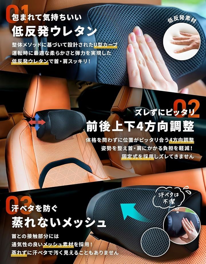 長距離ドライブでも快適に使える車のヘッドレストとして、快適な運転姿勢を維持できます。