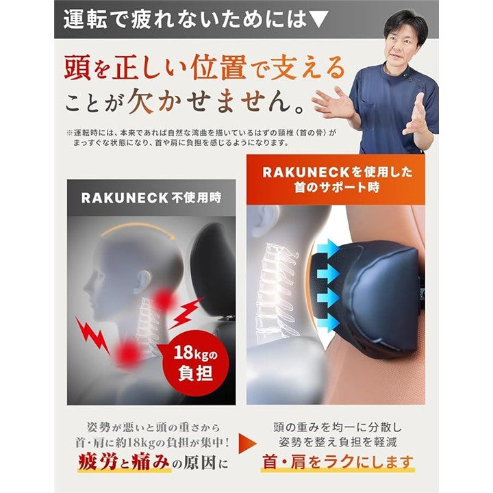 RAKUNECK (ラクネック) の最大の特長は、運転中に首へ集中しがちな約18kgもの負担を分散し、正しい姿勢を保つ点にあります。