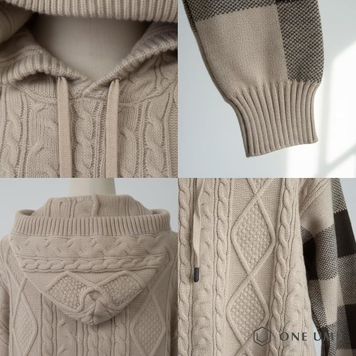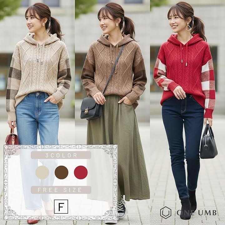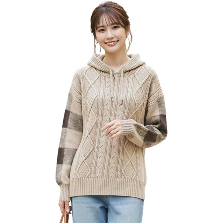 ニットパーカー レディース 長袖 セーター トップス チェック柄 秋 プルオーバー ケーブル編み チェック袖 可愛い フリーサイズ