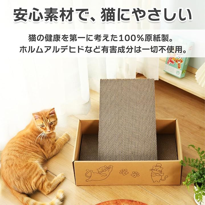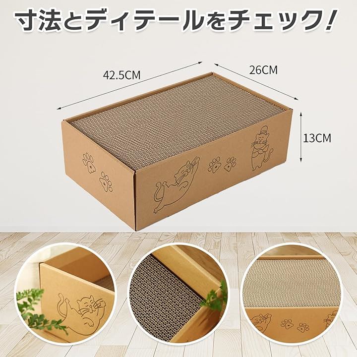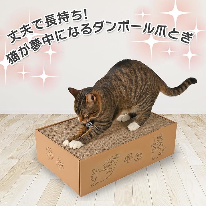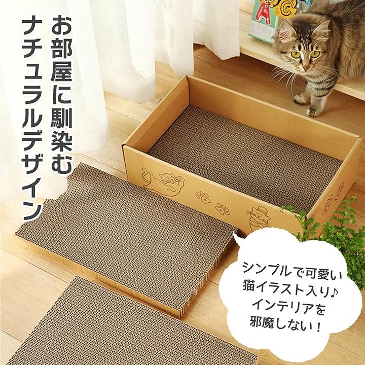 段ボール素材の適度な硬さとざらつきは、猫が夢中になって爪を研ぐ感覚を与え、家具やカーペットの傷防止にも効果的です。