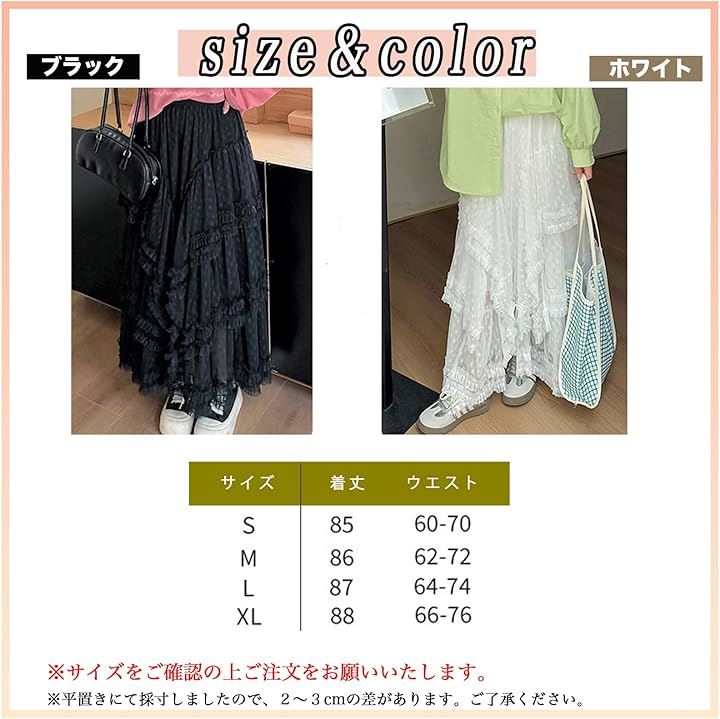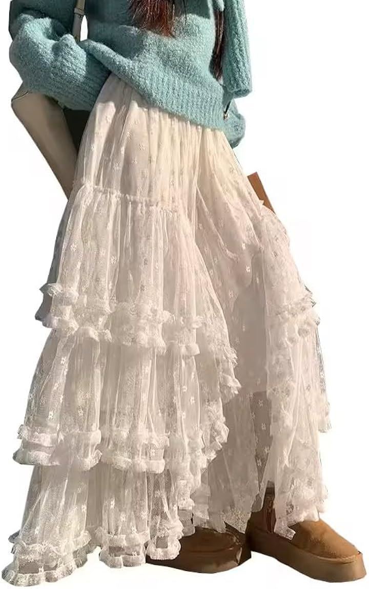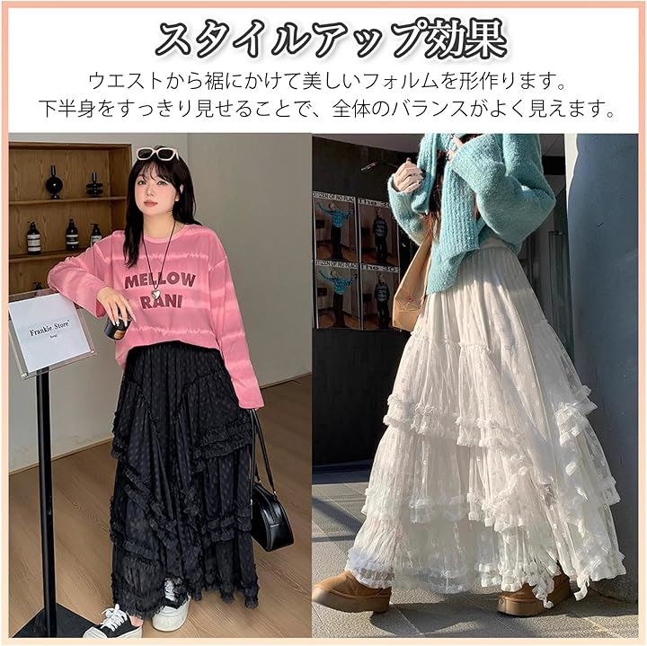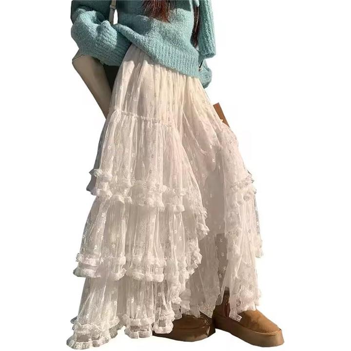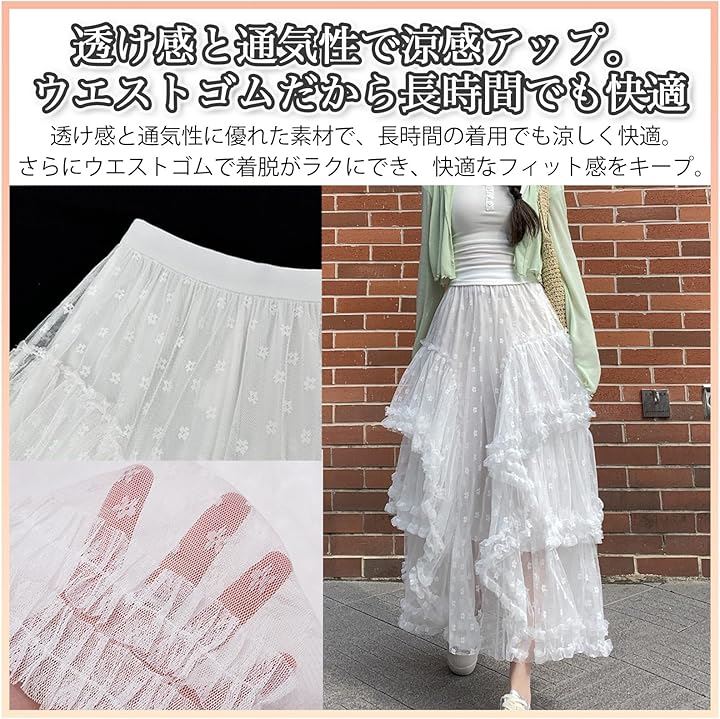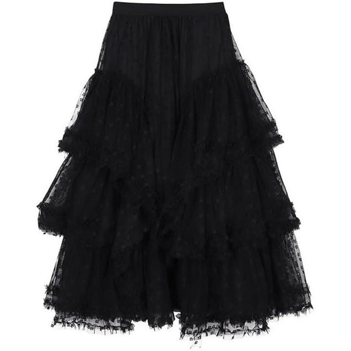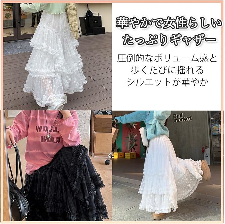 フレアロングスカート ガーリー マキシ丈 フリル チュール ティアード レース ロリータ レイヤード レディース