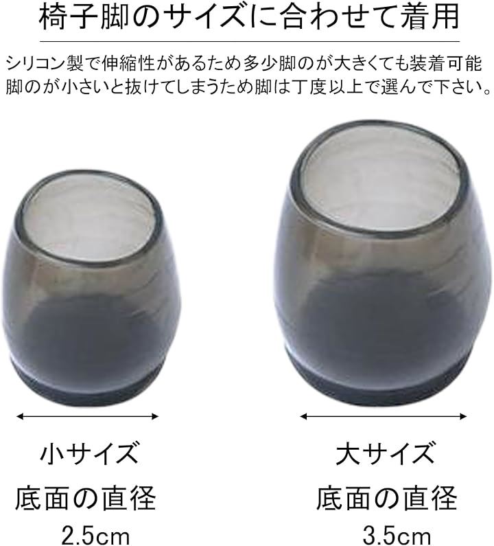 小(底面直径2.5cm)、大(底面直径3.5cm)と2サイズあるので、取り付け予定の椅子脚の底面のサイズを計測して下さい。