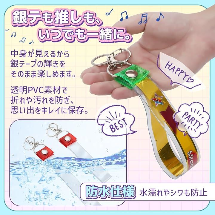 「防水仕様で外出先でも安心|カスタマイズも自由自在」 防水性のある透明PVC素材で作られているため、突然の雨やドリンクの水はねから銀テを守ります。