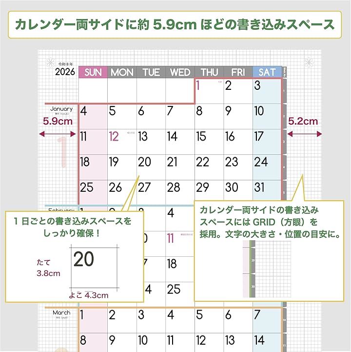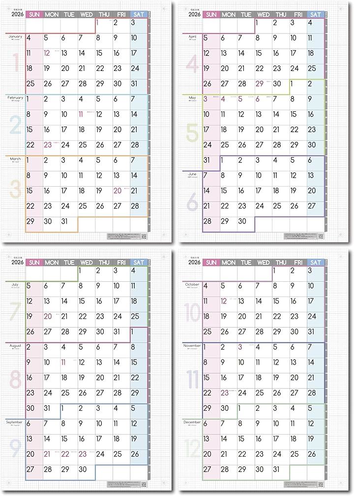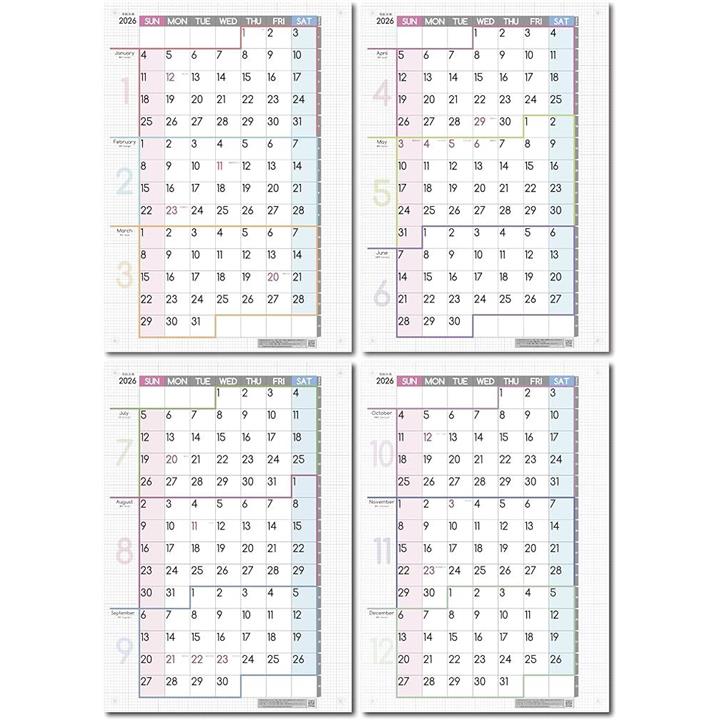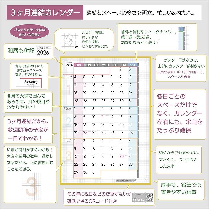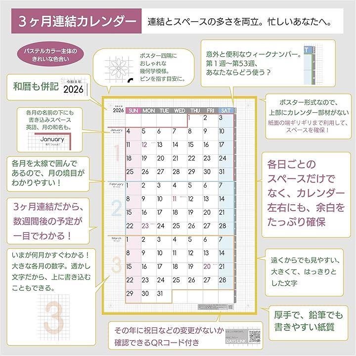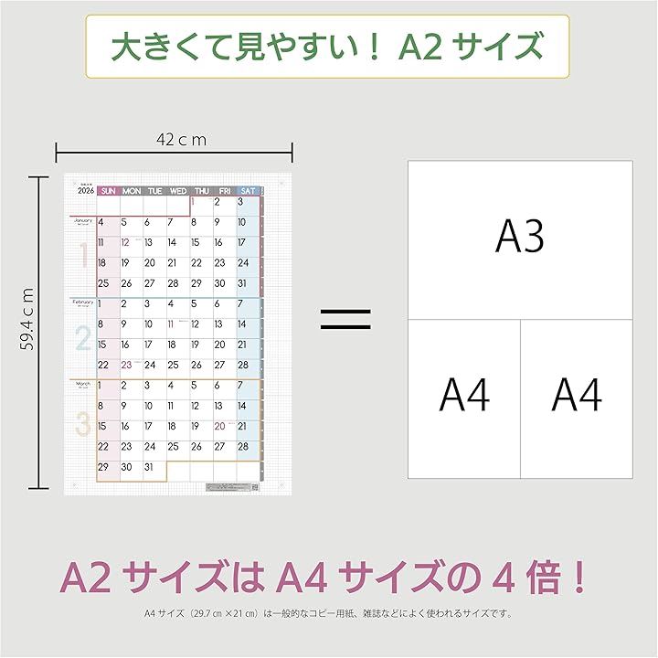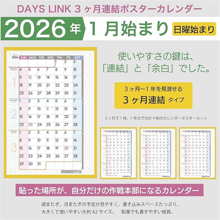 3ヶ月連結カレンダー ポスター 2026年 1月始まり 日曜始まり 大きい 壁掛け A2