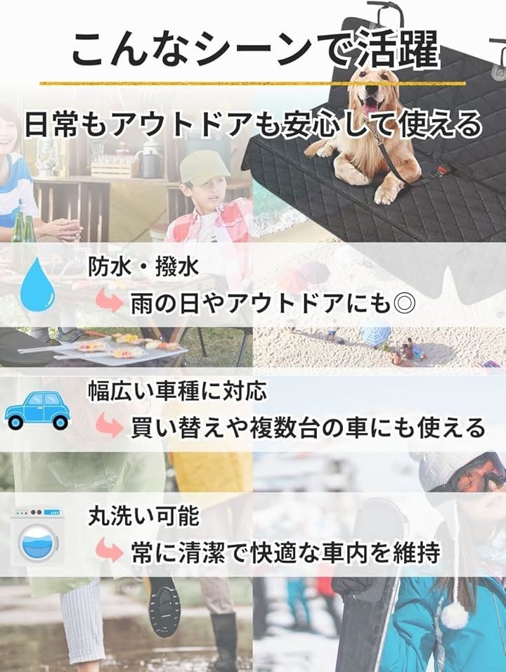 アウトドアやキャンプ、海や川遊び、山でのトレッキングやバーベキューなどのアクティビティ、ジムやスポーツ帰り、子どもとの外出、ペットの同乗など、汚れや水濡れが発生しやすい場面で活躍します。