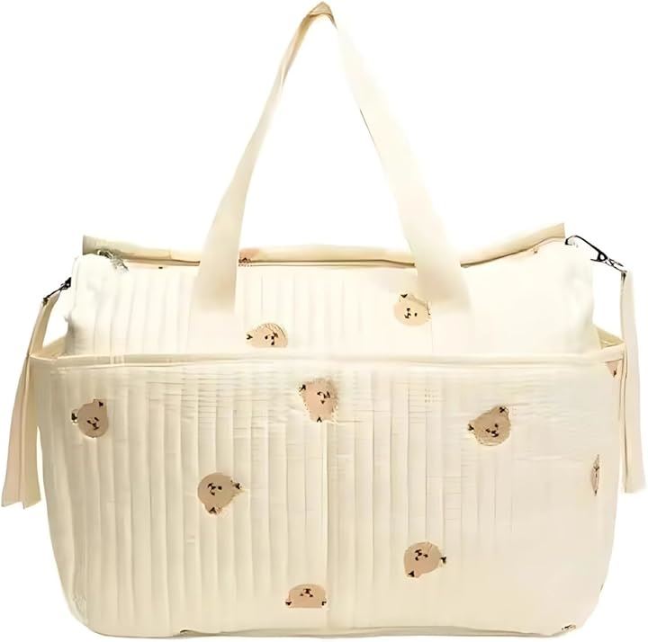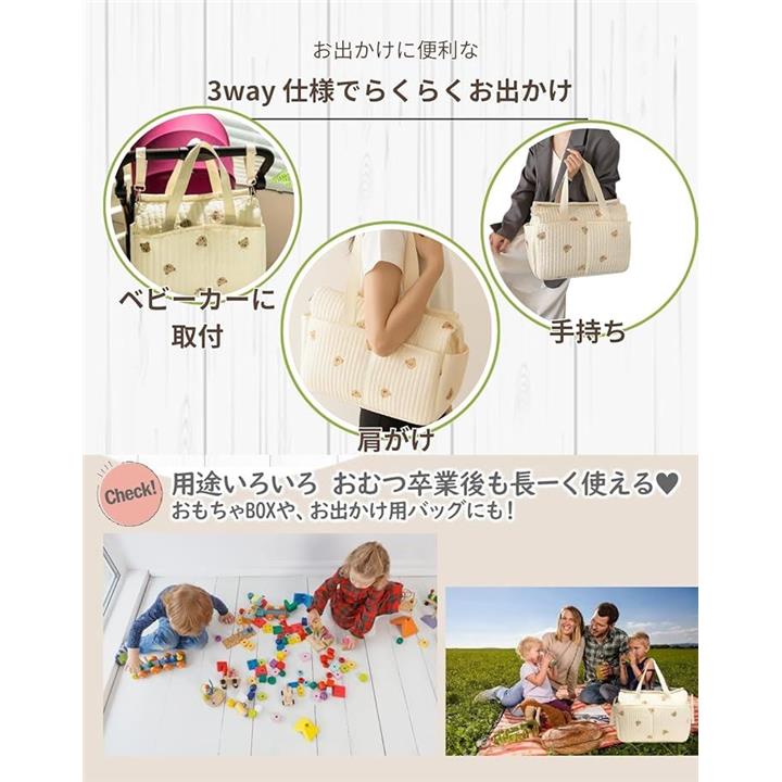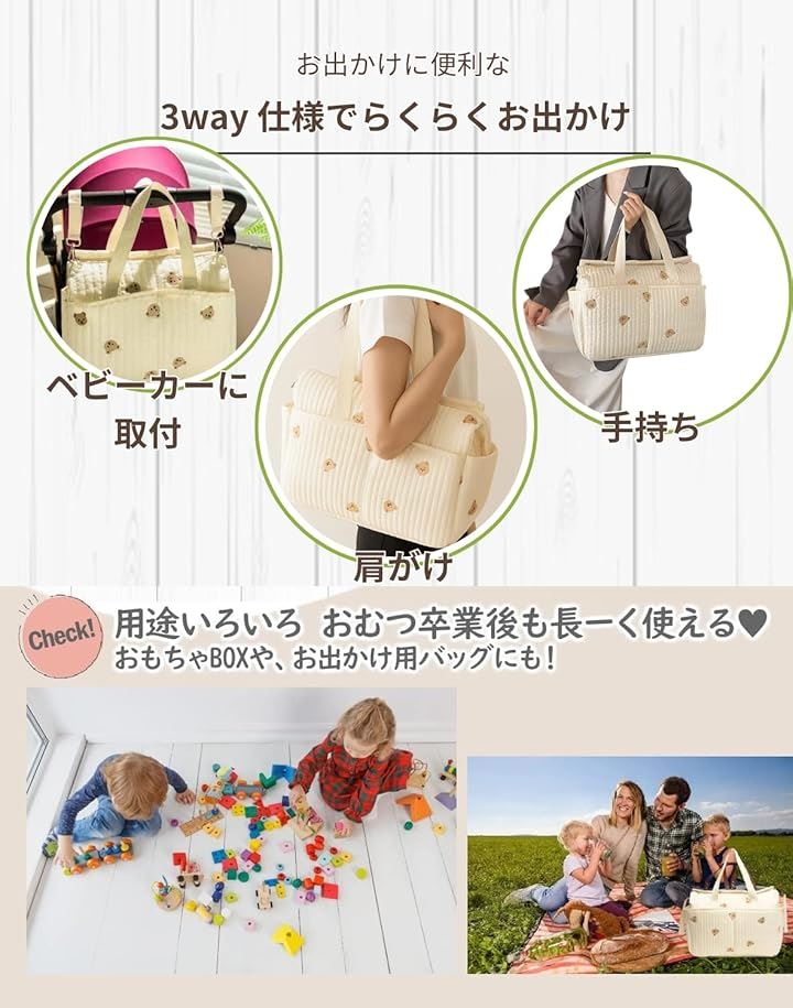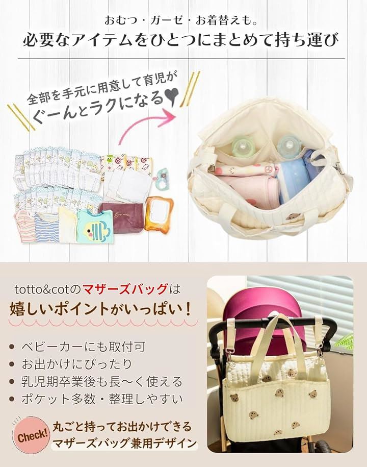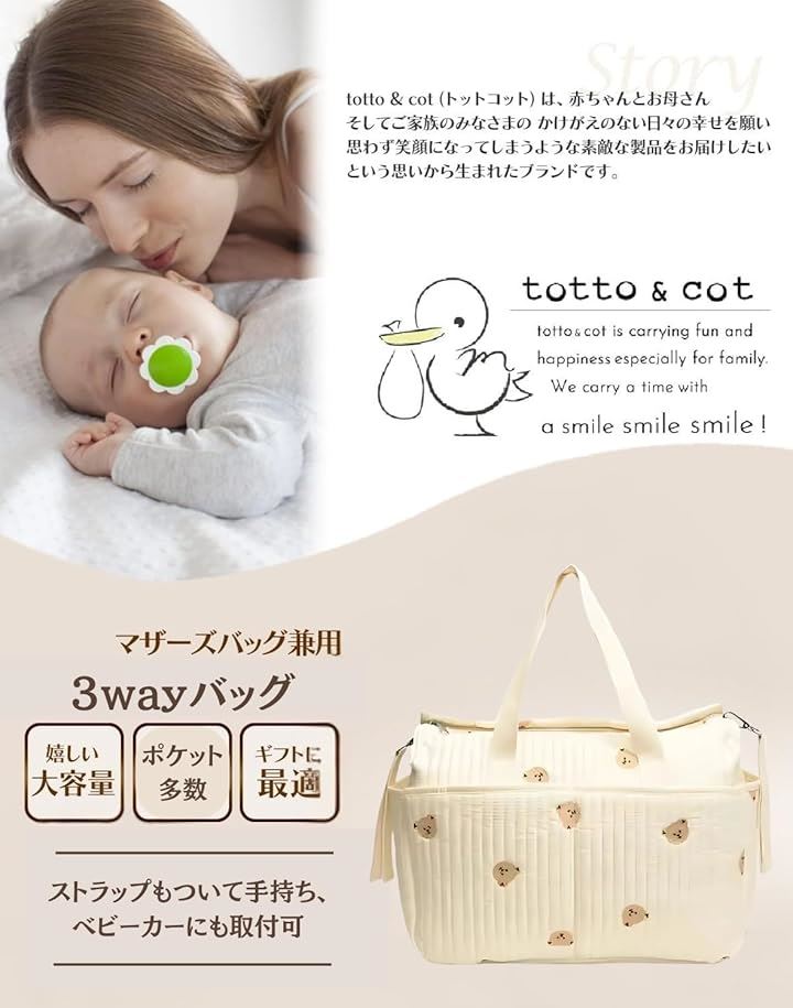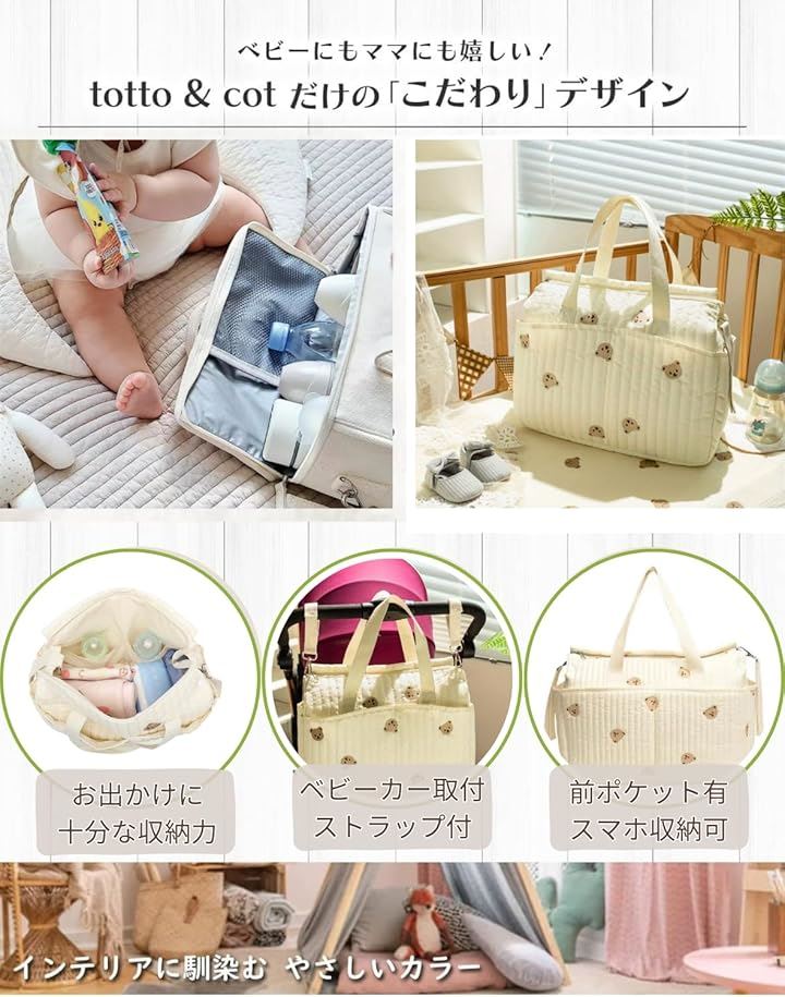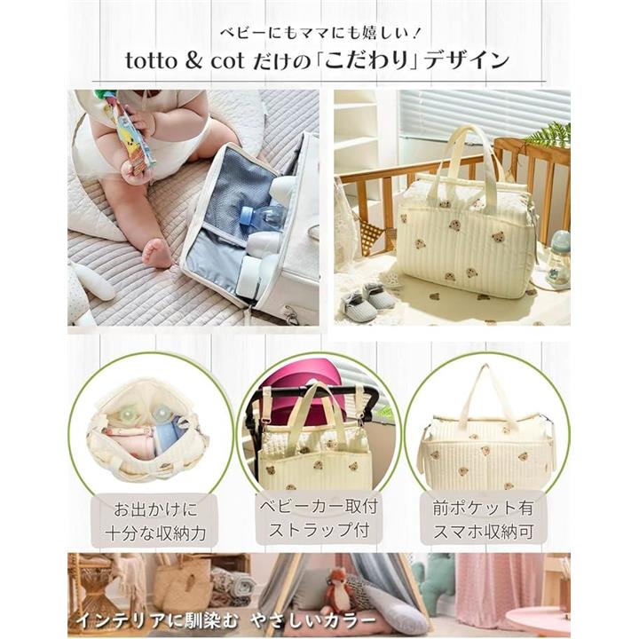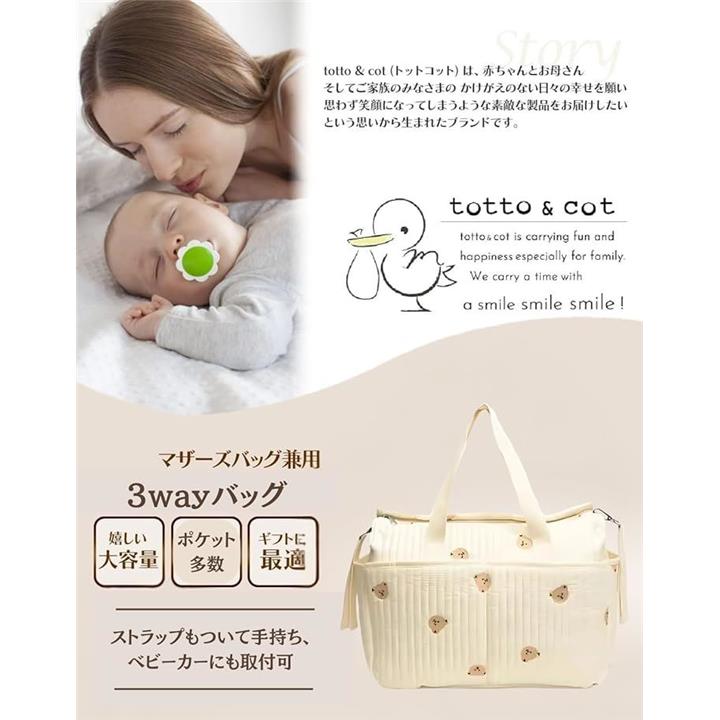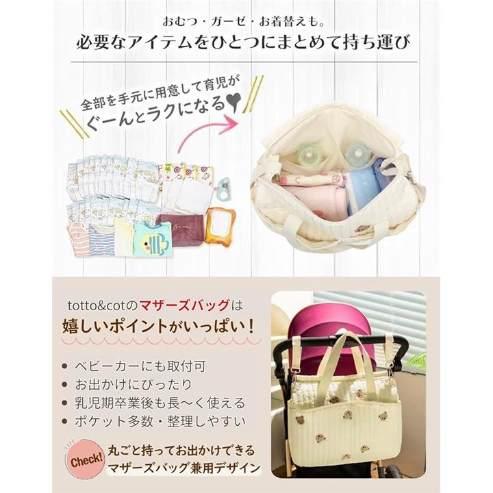 totto&cot 2way マザーズバッグ大容量 軽量 キルティング 刺繍 くま柄 トートバッグ 多機能 ポケット付き 出産準備 入院バッグ ヌビバッグ ママバッグ かわいい 通園くま